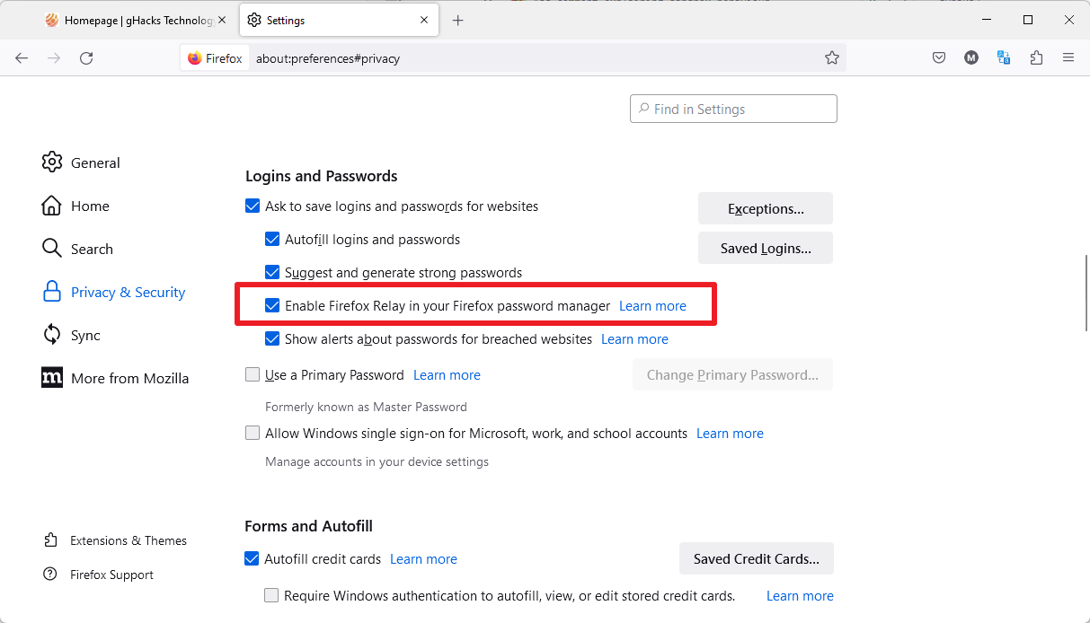 3. 勾选“在 Firefox 密码管理器中启用 Firefox Relay”。