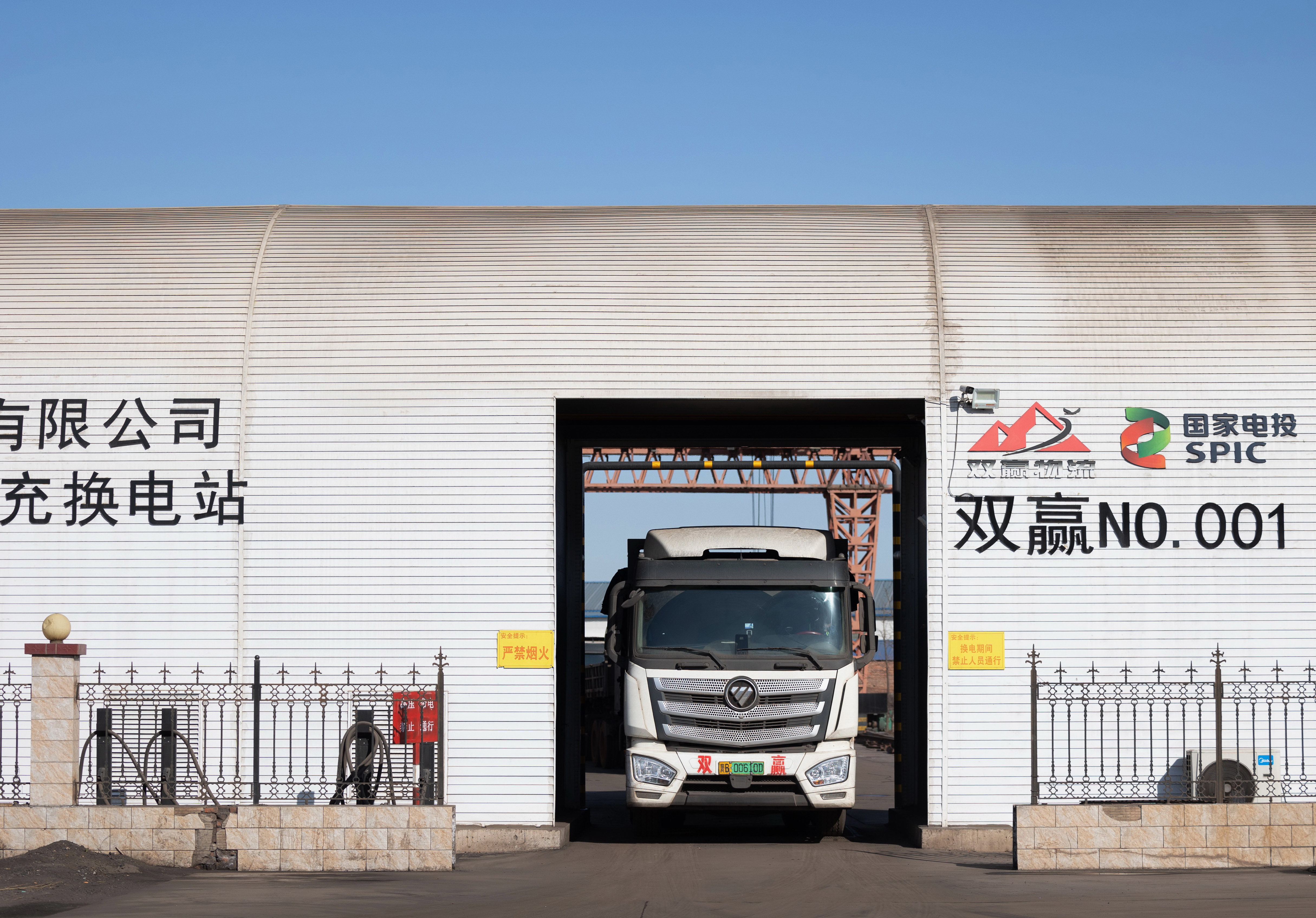 3月13日,唐山市丰南区的一家运输企业的电动重卡在换电站更换动力电池。新华社记者 杨世尧 摄