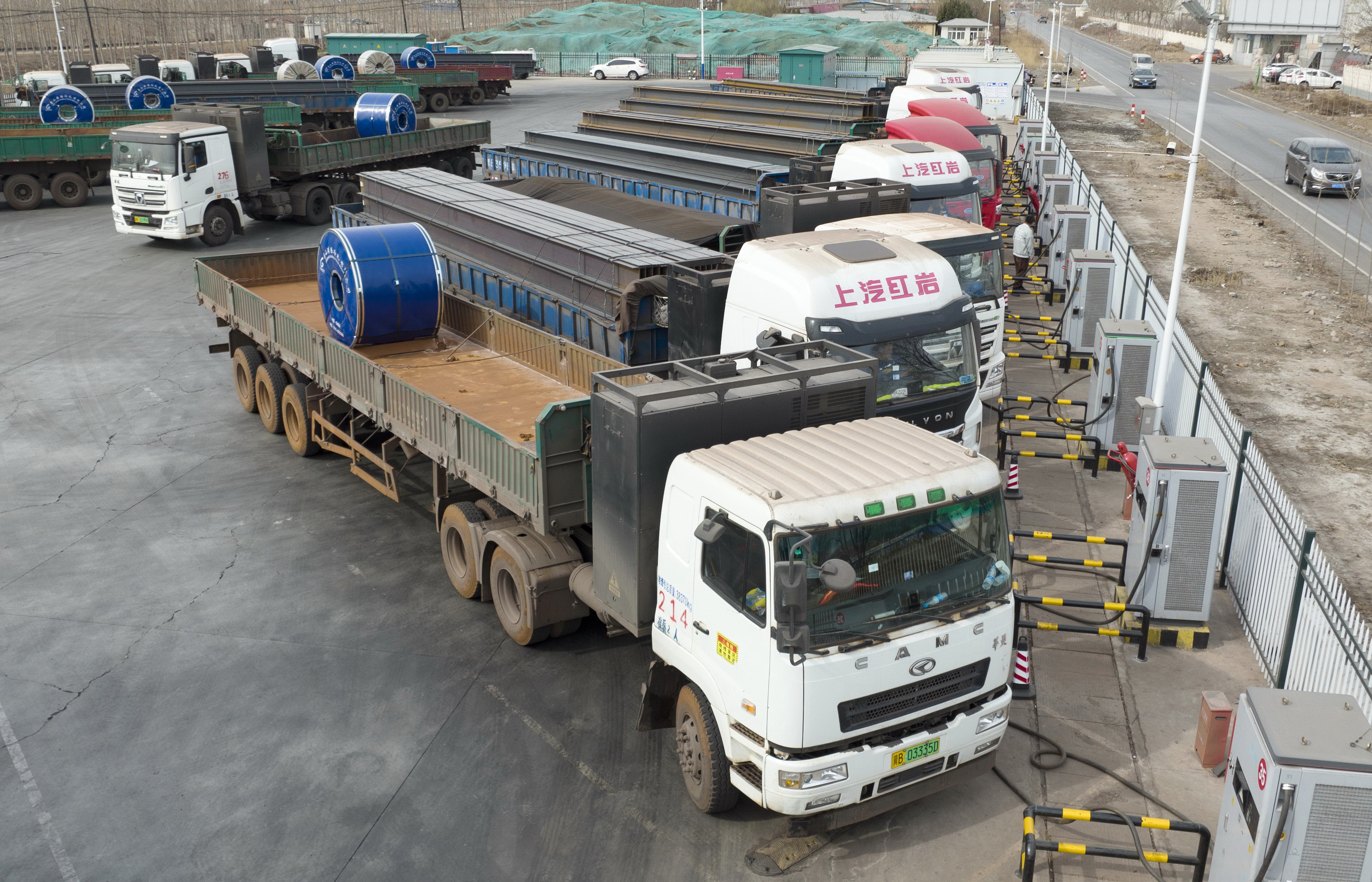 3月18日,唐山市曹妃甸区的一家运输企业的驾驶员将电动重卡停在唐海镇充电站准备给重卡充电。新华社记者 杨世尧 摄