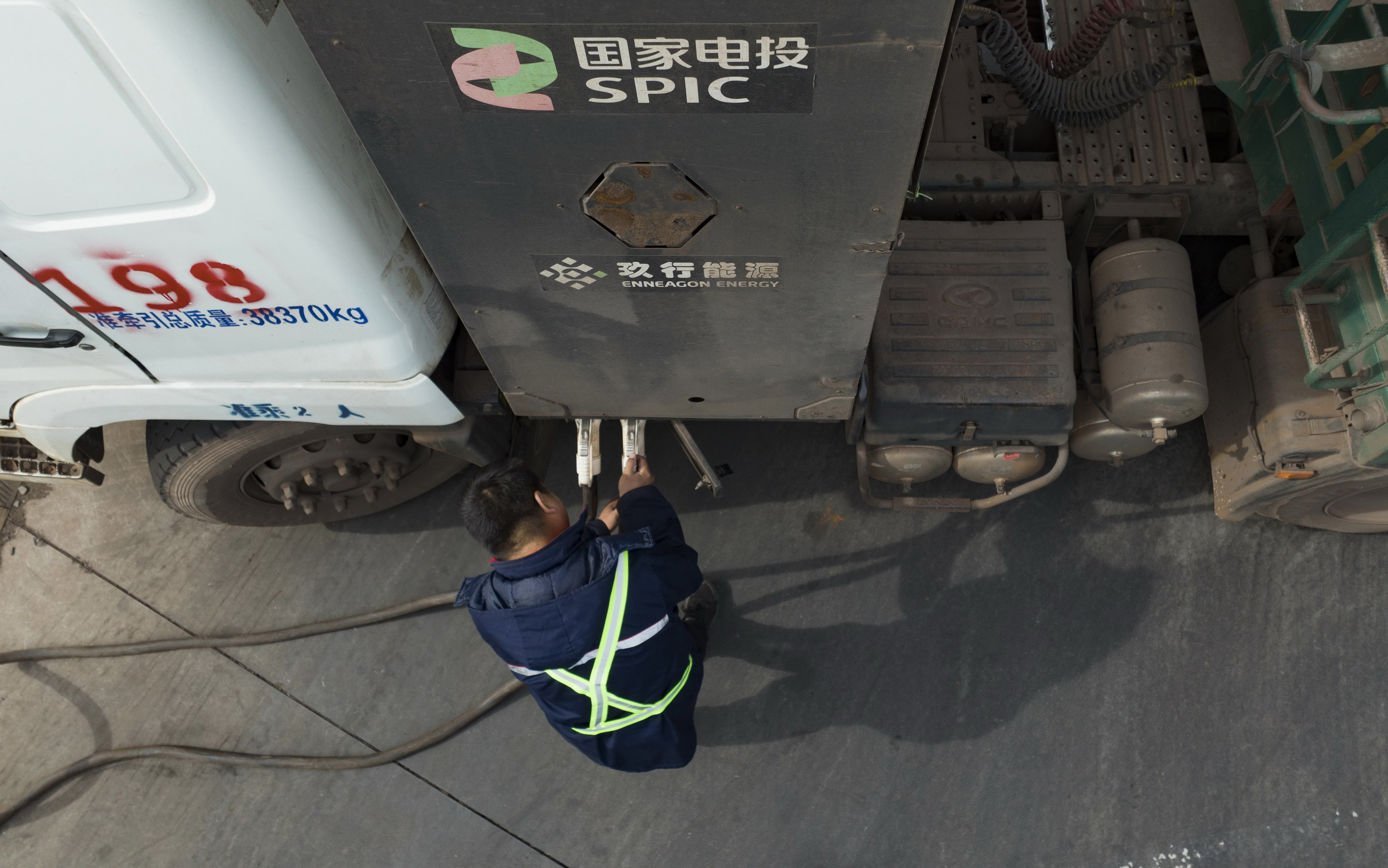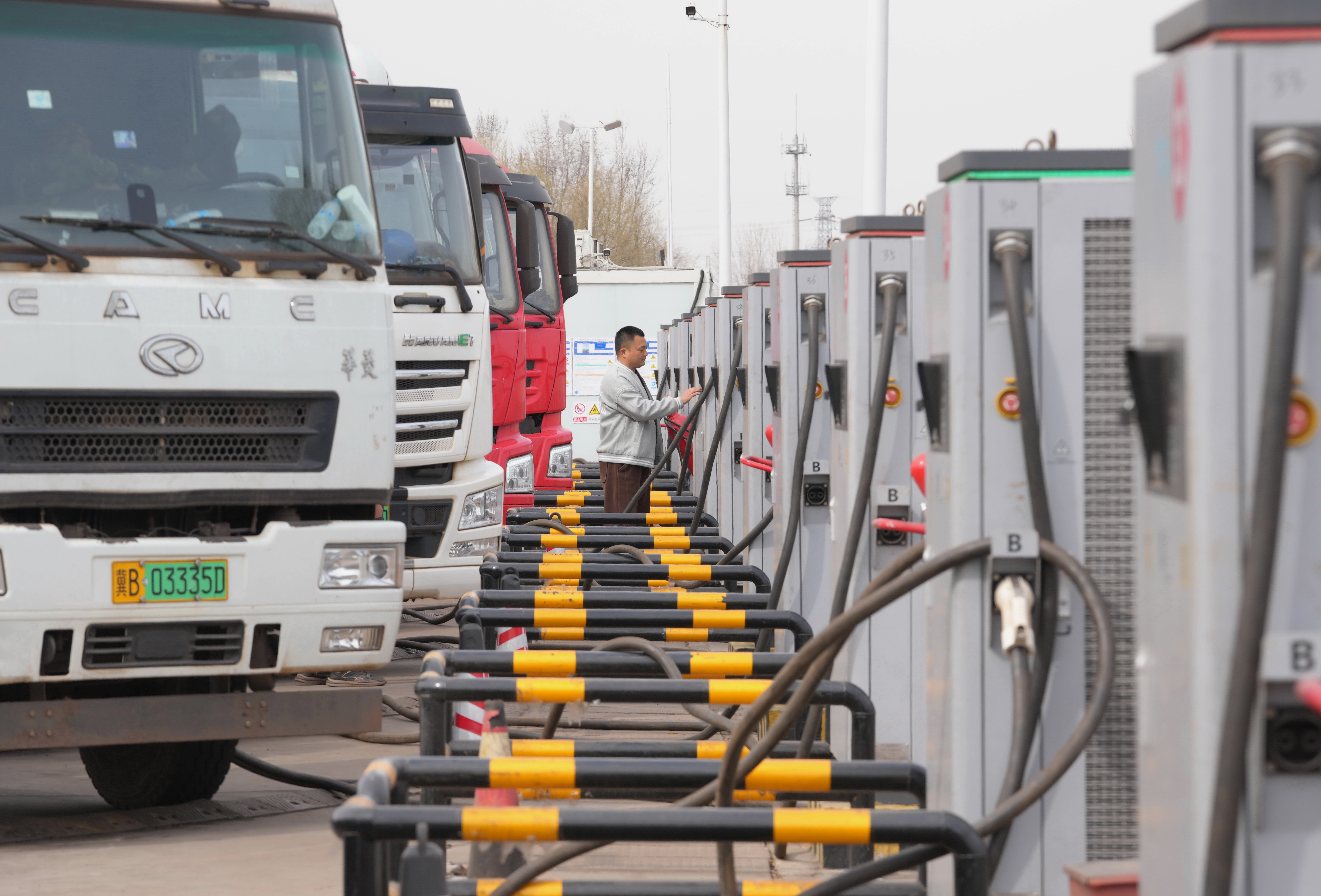 3月18日,唐山市曹妃甸区的一家运输企业的驾驶员将电动重卡停在唐海镇充电站给重卡充电。新华社记者 杨世尧 摄