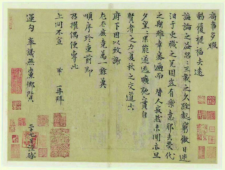 当年十月二十六日神宗已召见曾巩,“赐对延和殿”,并结束了外放生涯。因此,这封信只能书写于九、十月间。由于信末已写明“二十七日谨启”。而九月至十月二十六日之间只有一个“二十七日”,即九月二十七日,它便是书写本札的确切日期。