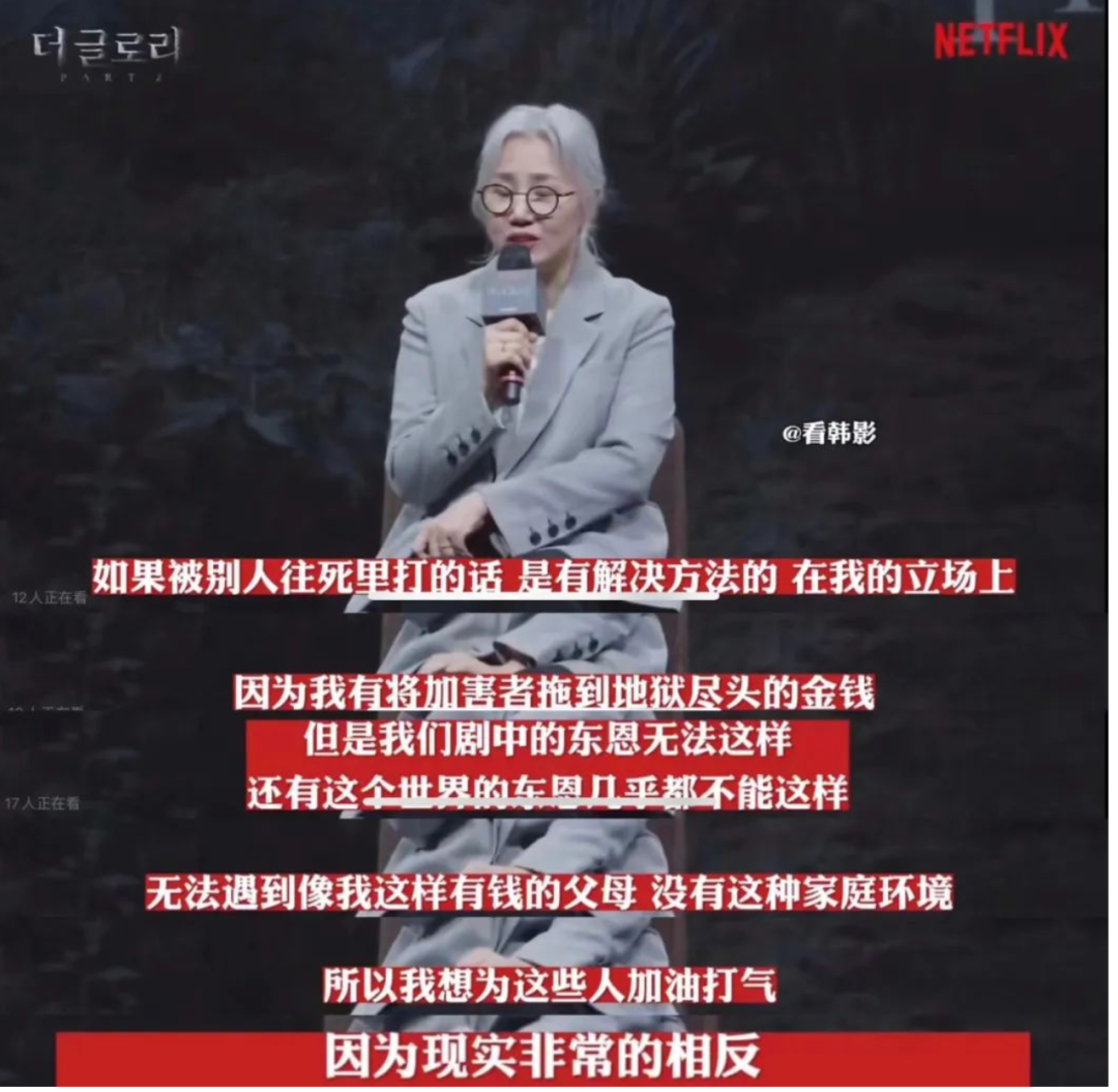 暂且忽略《黑暗荣耀》的精英男主,剧里每个帮助文东恩走向复仇成功的都是普通女性:中学时唯一关心她的女校医、工厂的同龄小姐妹、同病相怜的大婶还有相互救赎的房东奶奶。