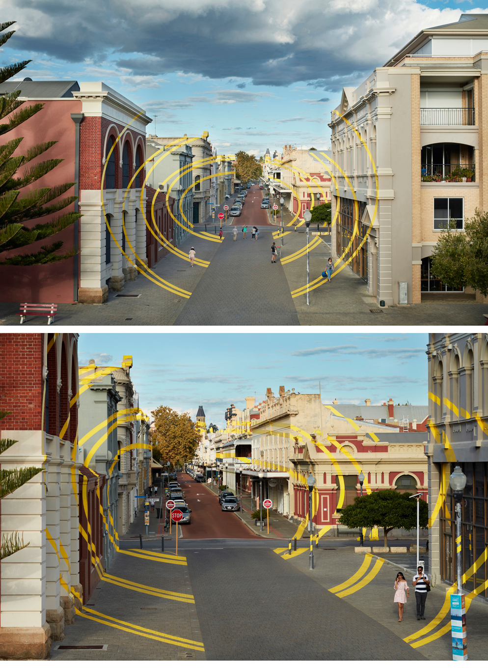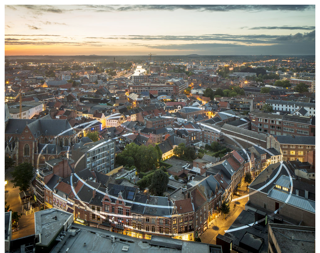 乍一看,这些破碎的圆圈就像散落的一些碎片,毫无逻辑和秩序,但其实观看者站在某一个精准的角度望向小镇时,所有图案就会在空间内形成一个非常立体的形象。