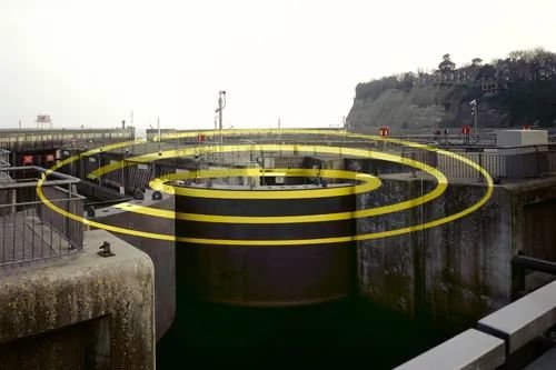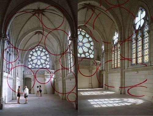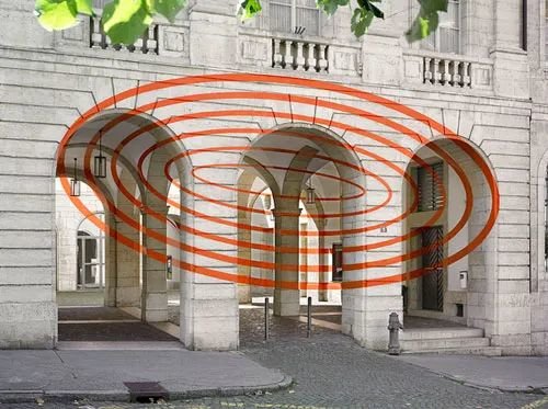 整个城堡都笼罩着一种奇妙的视觉差之中,这些同心圆如同波浪一般在整个空间中慢慢展现,只有在特定的角度时,破碎的圆圈才能形成一个完整体。