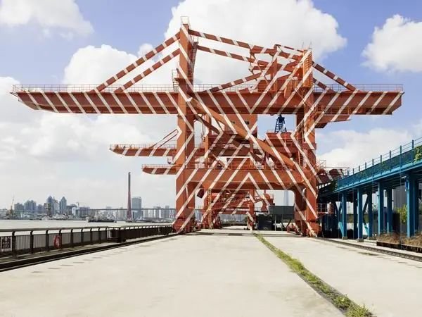 这件作品就地取材,依托江边原有的工业遗存,橘红色的起重机上布满了白色的几何线条,只有当参观者走到某一个正确的角度时,所有的直线才能够被连接起来,形成完整的图案。而找到正确的地方观看,正是艺术家和公众玩的一场“捉迷藏”游戏。