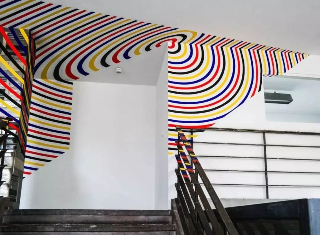 这些作品看似只是几何线条的拼凑和堆积,但其实每一个图案都需要艺术家精确的计算,以及具体实践中对空间、景深和投影的把握。而当观众站在了最佳角度的同时,艺术家也与观众进行了一场时空的对话。