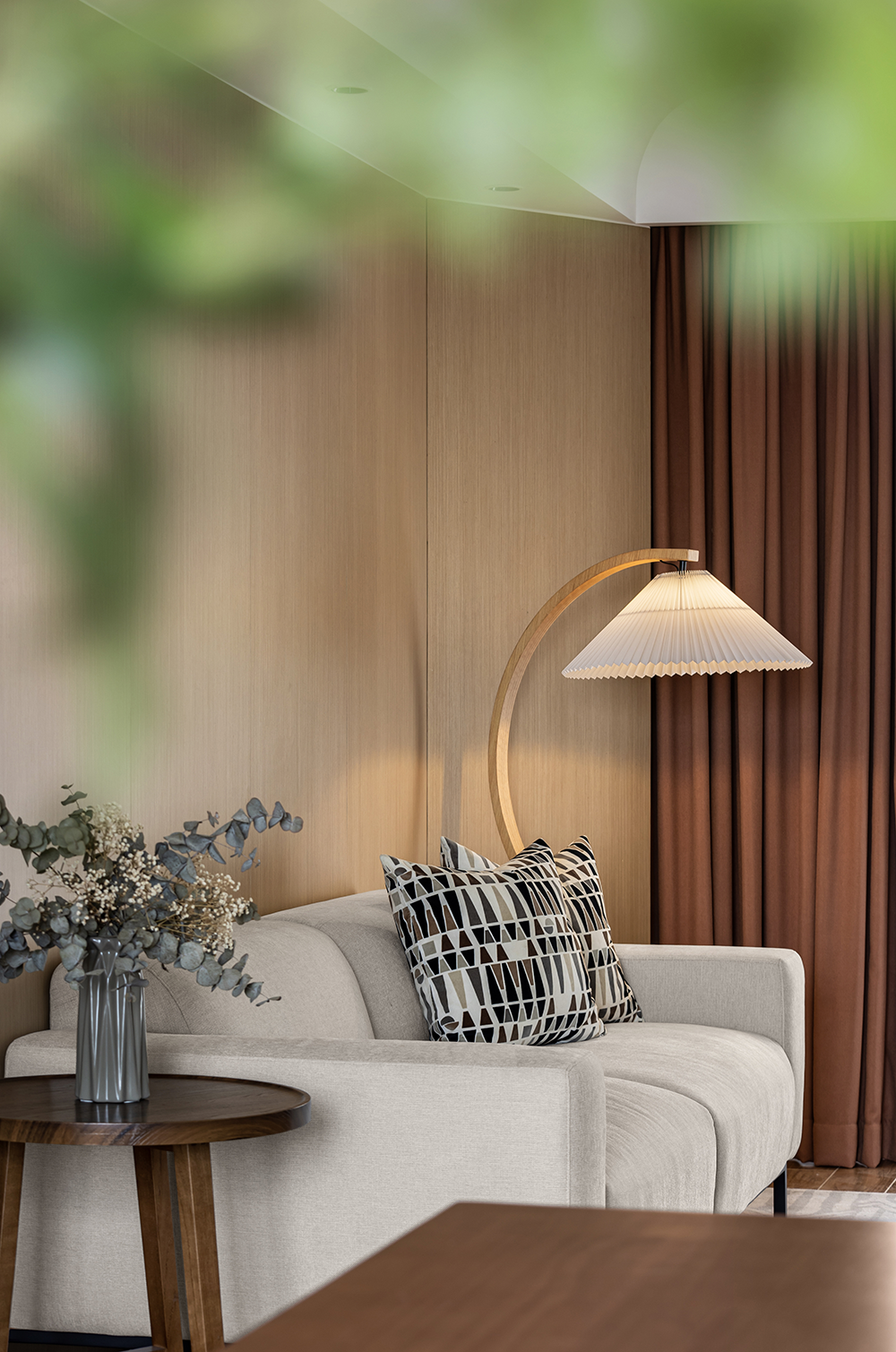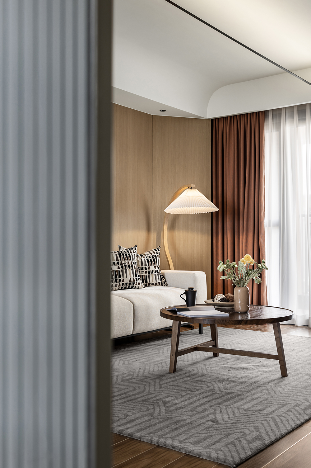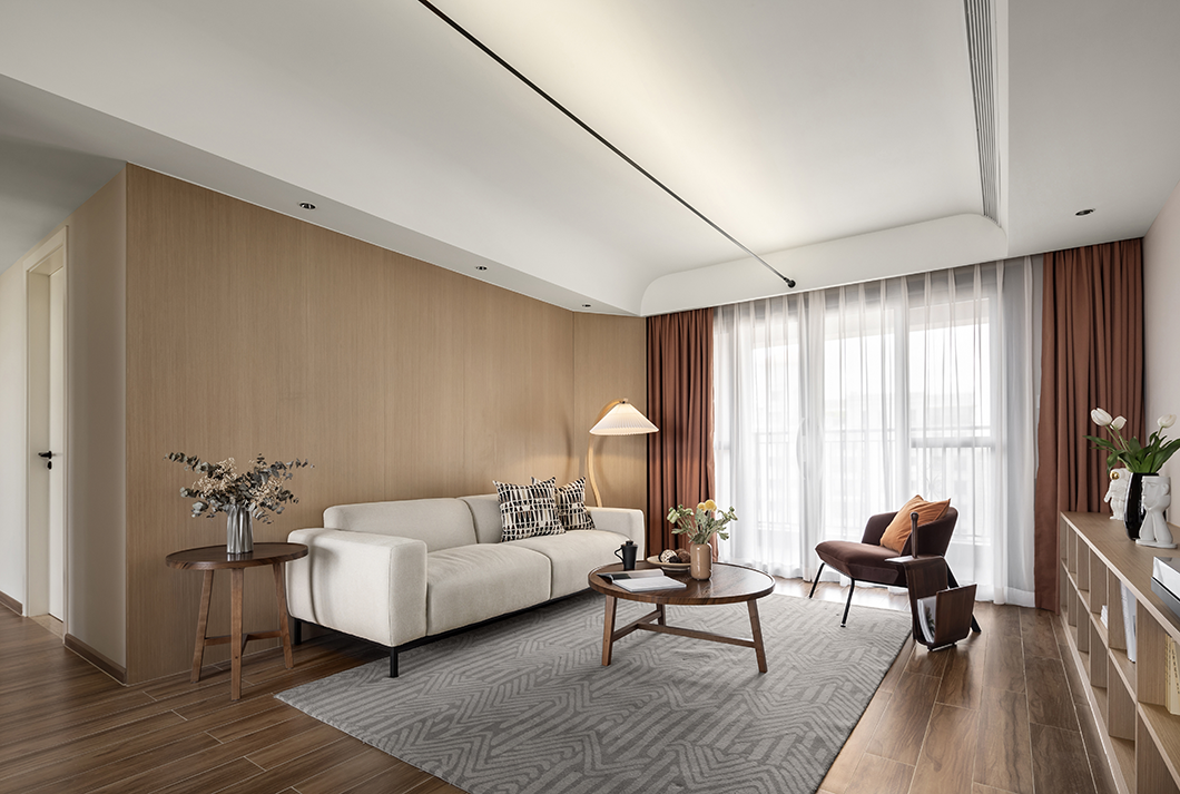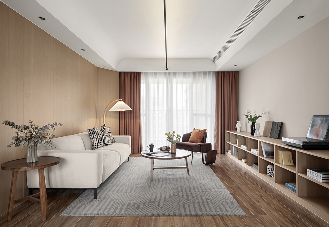 ▲沙发墙用浅色木饰面满贴,搭配简易的布艺沙发与木质家具,整洁又高档,再搭配一款咖啡色窗帘,地面铺上浅灰色地毯,整个空间都变得暖暖的。