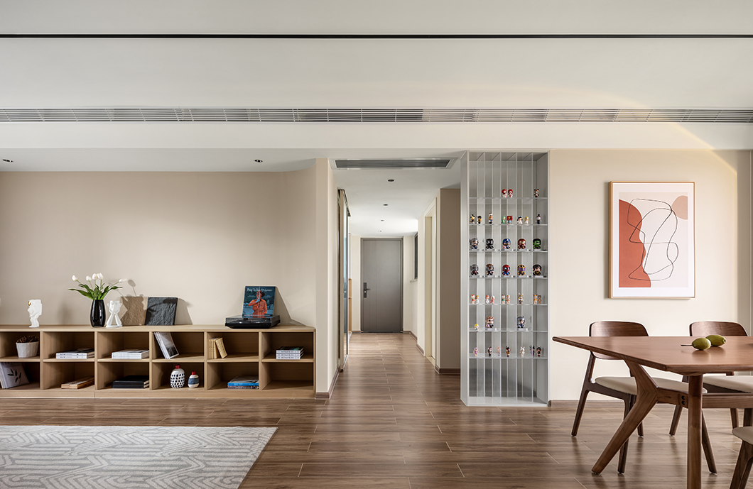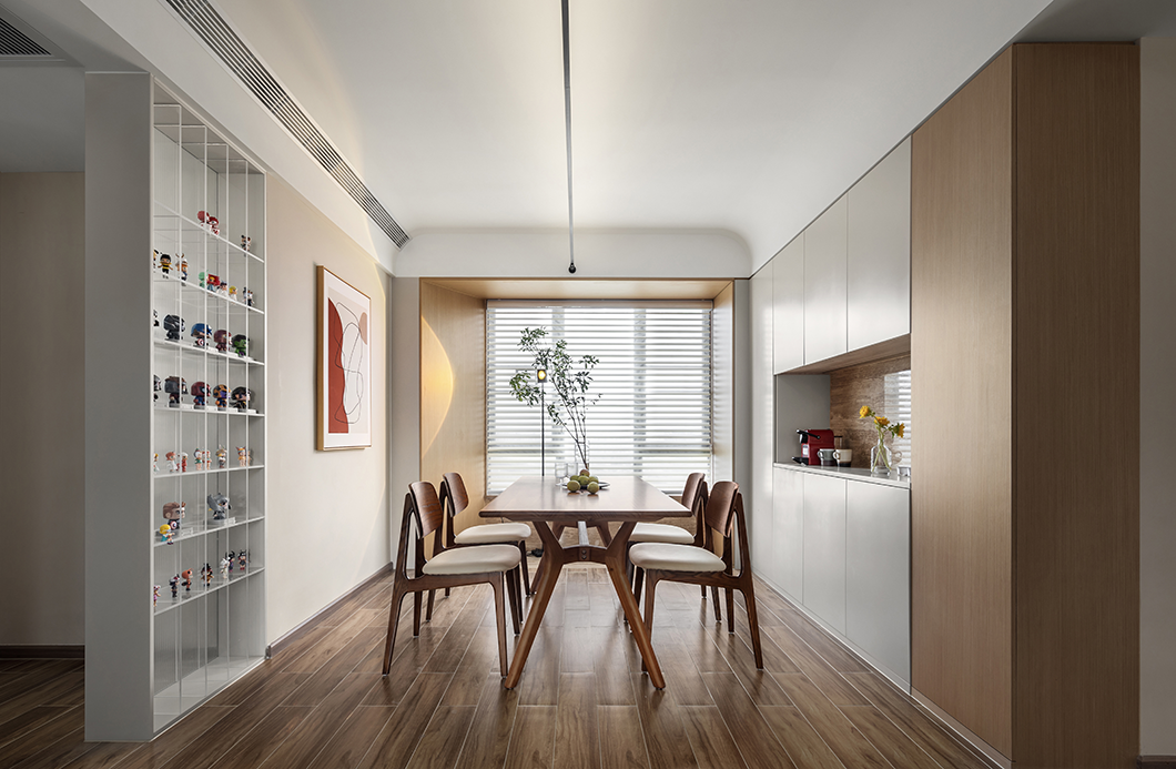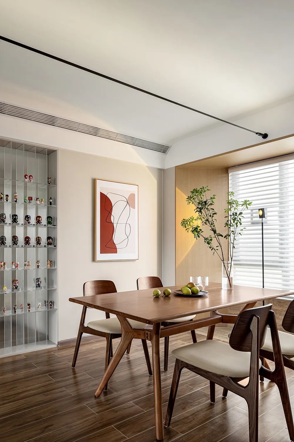 ▲餐厅墙设计了一款亚克力装饰架,让各种小手办有了容身之处,而且也成了整屋的一个亮点之一。