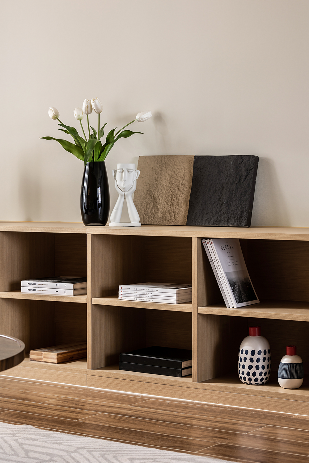 ▲电视墙的原木色矮柜,收纳各种各样的书籍及装饰品,为生活带来了乐趣。