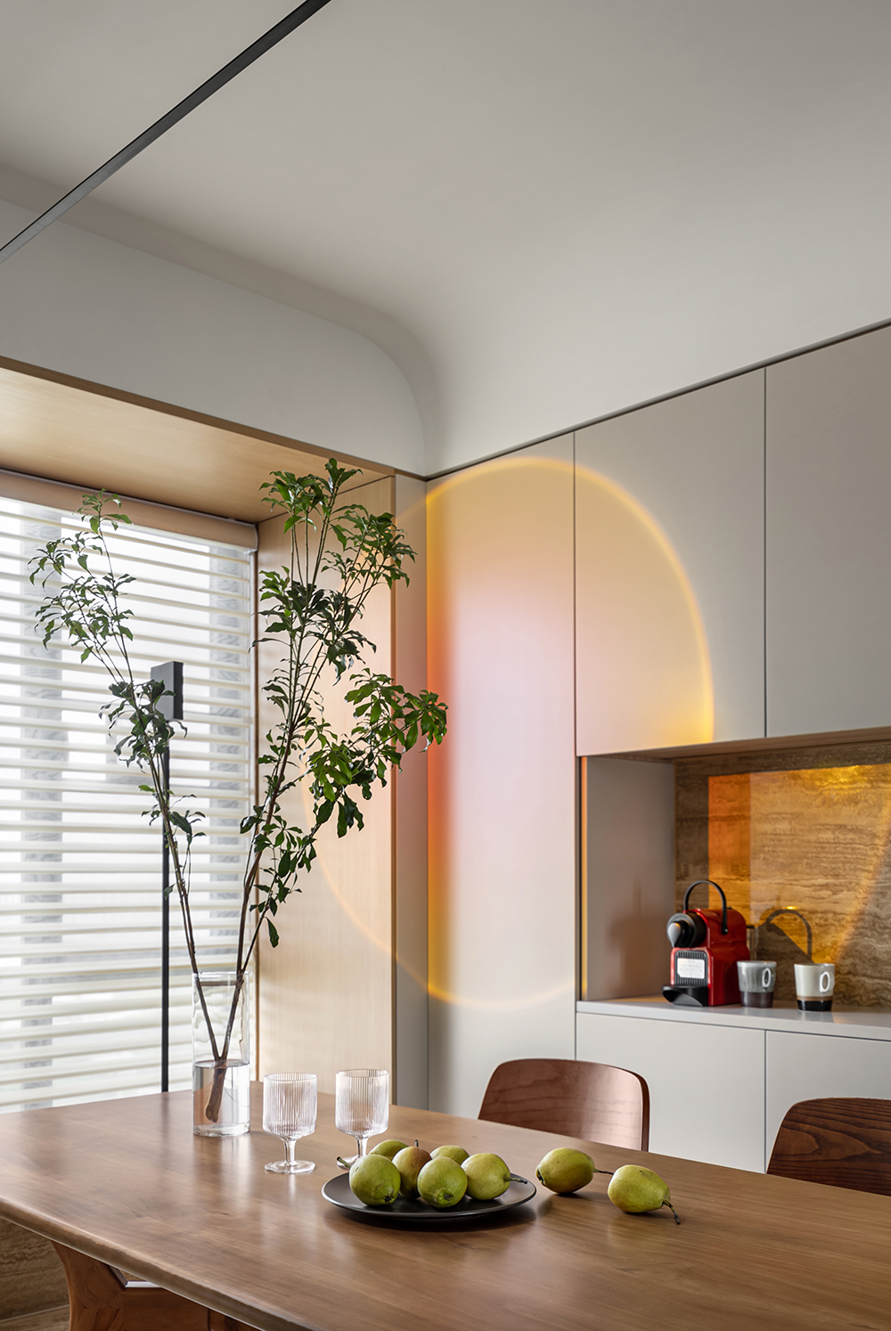 ▲餐厅的设计与客厅是统一的,不仅色彩,还有斜的墙面造型,圆弧天花造型,每一个细节都透露出了整个空间的统一性。