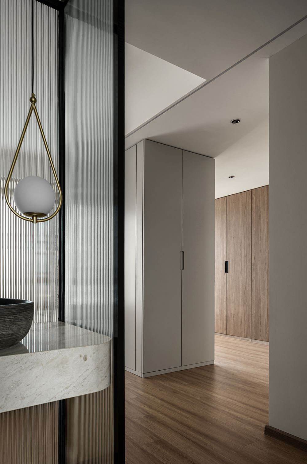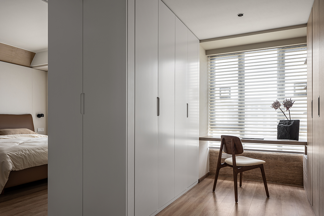 ▲主卧设计了一个衣帽间,实现空间功能具体化,左右两边摆上衣柜,男女主人也能更好地分类收纳。靠窗设置一张悬空书桌,搭配百叶帘的设计,也使得空间充满轻松自然的气息。
