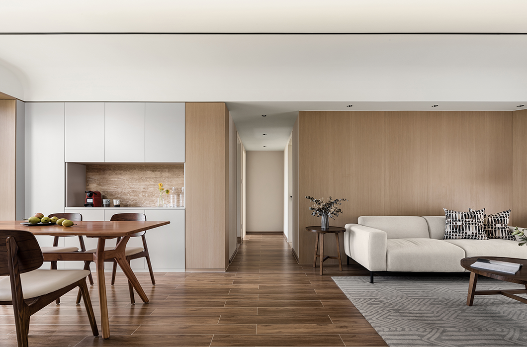 ▲整厅通铺木纹砖,客餐厅一体的格局,整个空间显得简约自然而狂潮舒适。