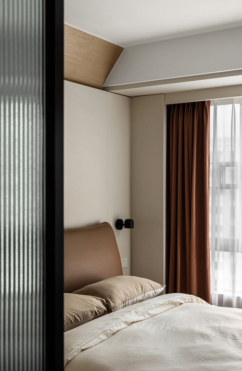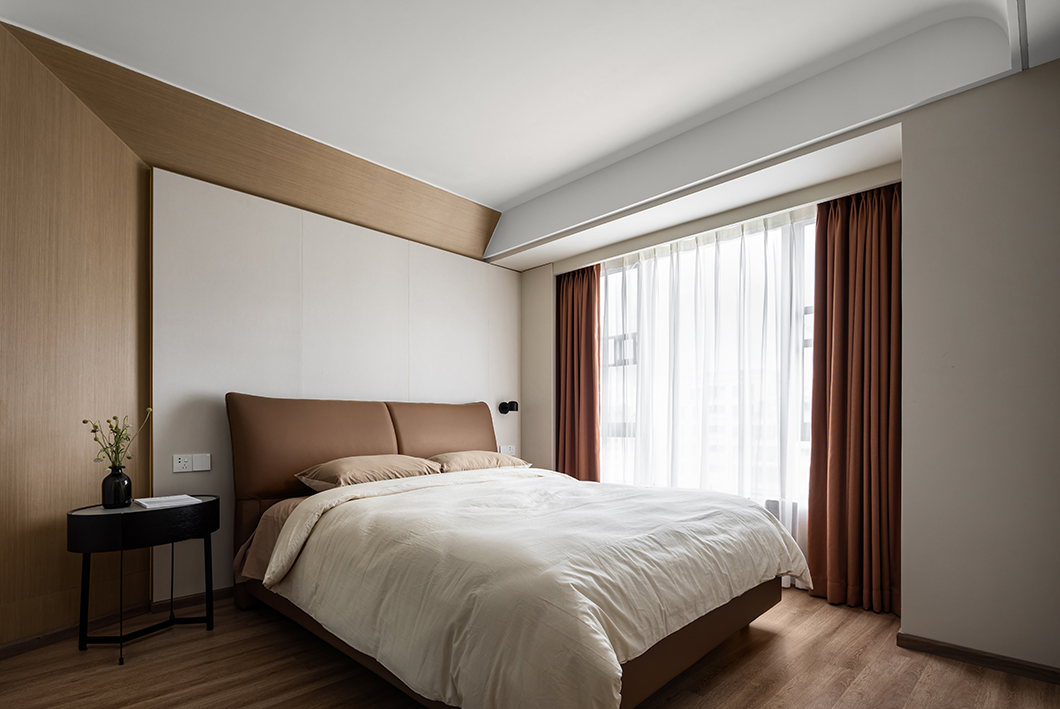 ▲主卧背景墙原木色与白色相撞,斜面的造型,时尚有趣,窗帘选的是与客厅同款,整屋保持统一格调,让软装的搭配也显得简单多了。
