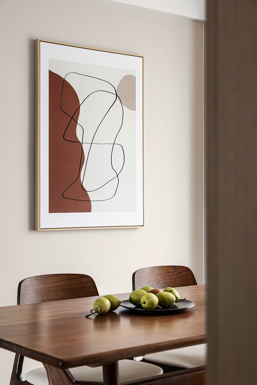 ▲抽象油画让单调的墙面也变得有趣起来,实木餐桌上的果盘布置,与空间相呼应,也让空间显得端庄而清新自然。