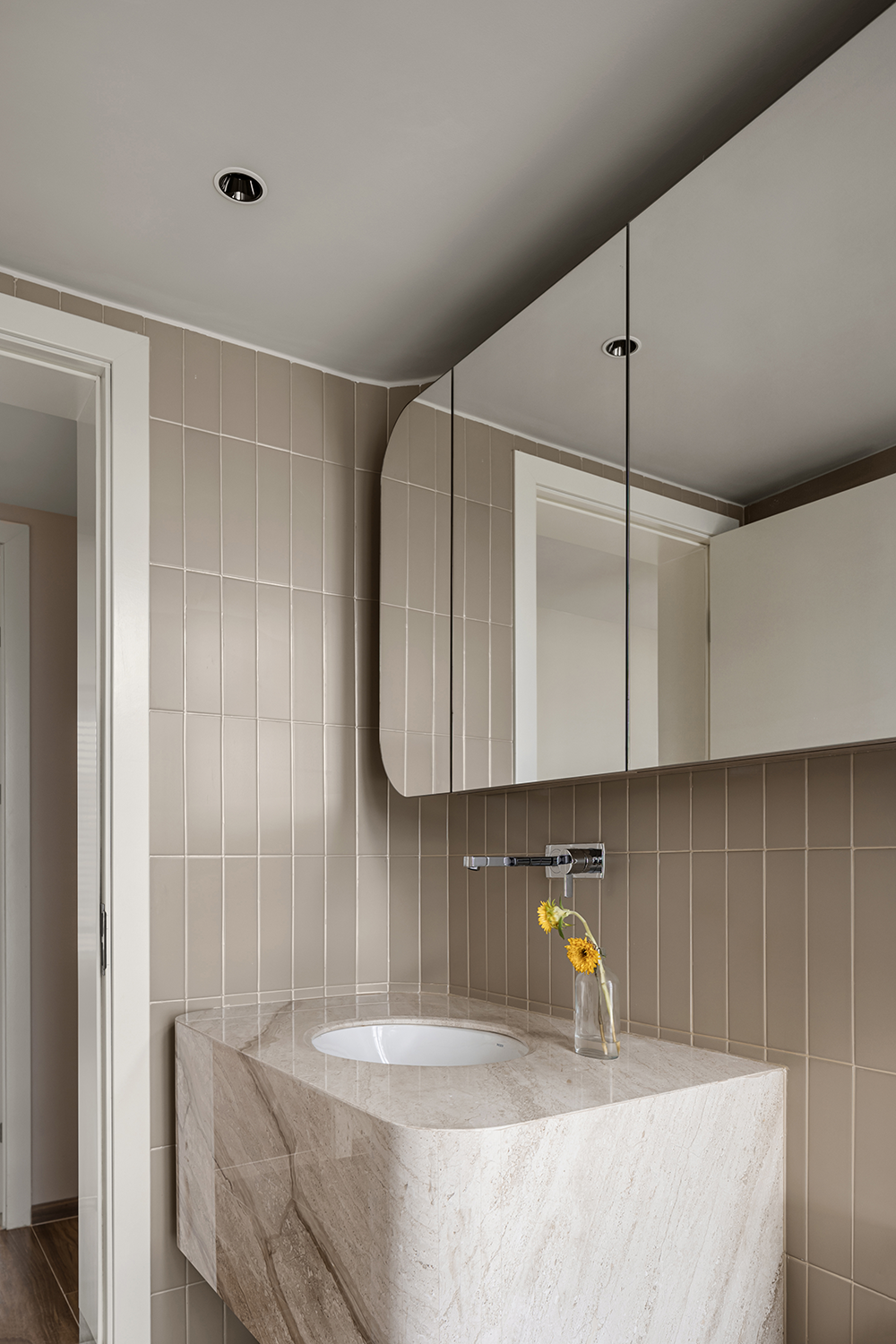 ▲公卫的洗手盆与墙面同色系的大理石材质,结合一个椭圆造型的镜柜,营造出一个儒雅洁净的卫浴环境,让卫生间看起来高档又大气。