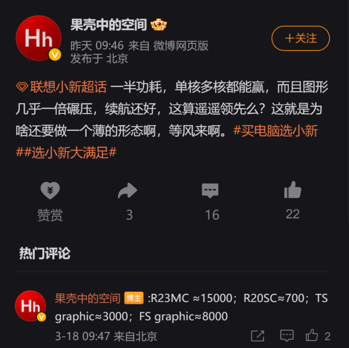 该博主称这款处理器“一半功耗,单核多核都能赢,图形几乎一倍碾压”,这里对比的应该是英特尔的相同定位竞品。此外,他还暗示联想小新笔记本将为这款处理器推出一款“薄形态”的产品,可能是二合一笔记本。