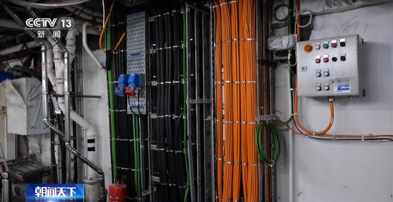 总台央视记者 李宁:如何确保这样一艘海上巨无霸的正常运行,靠的就是我身后的这些电缆,这些电缆就好比这艘船上的神经和血管,它的总长度超过4300公里,比哈尔滨到三亚的距离还要远。