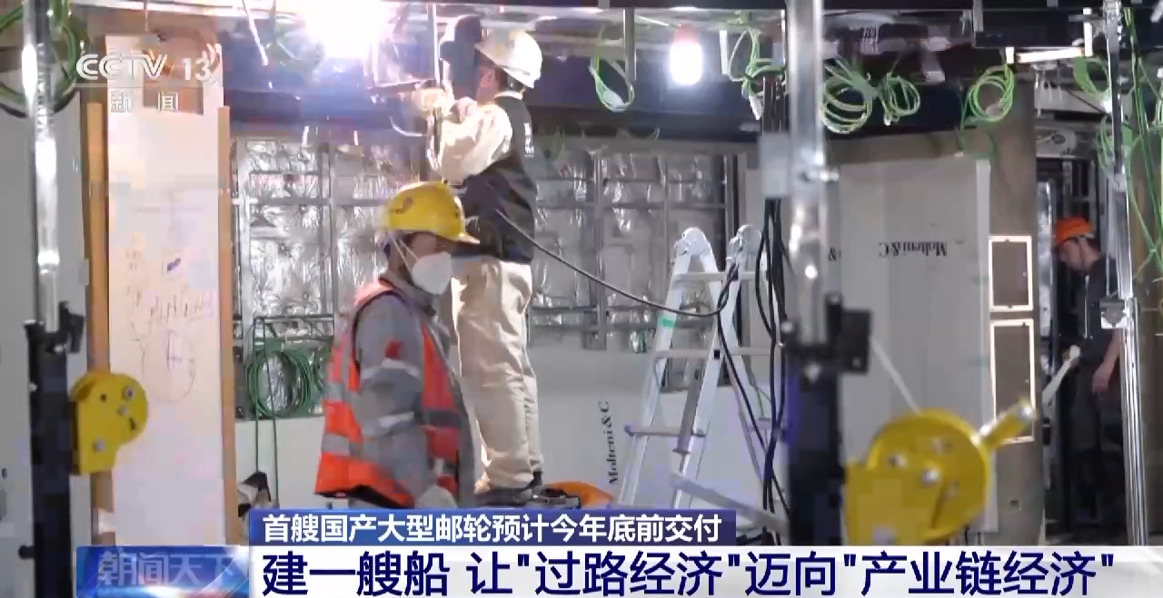 中国船舶外高桥造船邮轮办公室主任 大型邮轮工程项目副经理 易国伟:电缆要提供控制信号,这条船它也是智能化的一条船舶,所有上面用的娱乐设施、照明设施,都可以通过中央控制系统来控制。