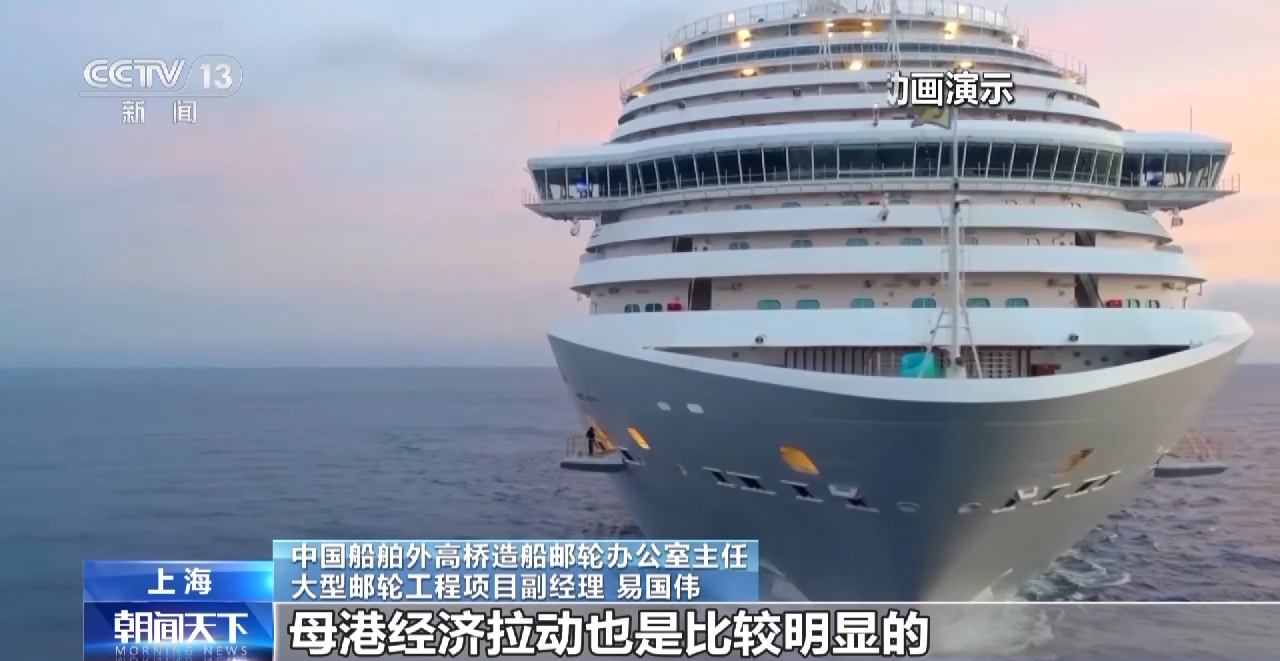 中国船舶外高桥造船邮轮办公室主任 大型邮轮工程项目副经理 易国伟:顾客在登船和下船以后,在当地也会进行对应的消费和娱乐,所以对当地港口的母港经济拉动也是比较明显的。中国的邮轮产业如果按照正常的发展速度,预估在2035年可以达到一年5000亿元的产值。