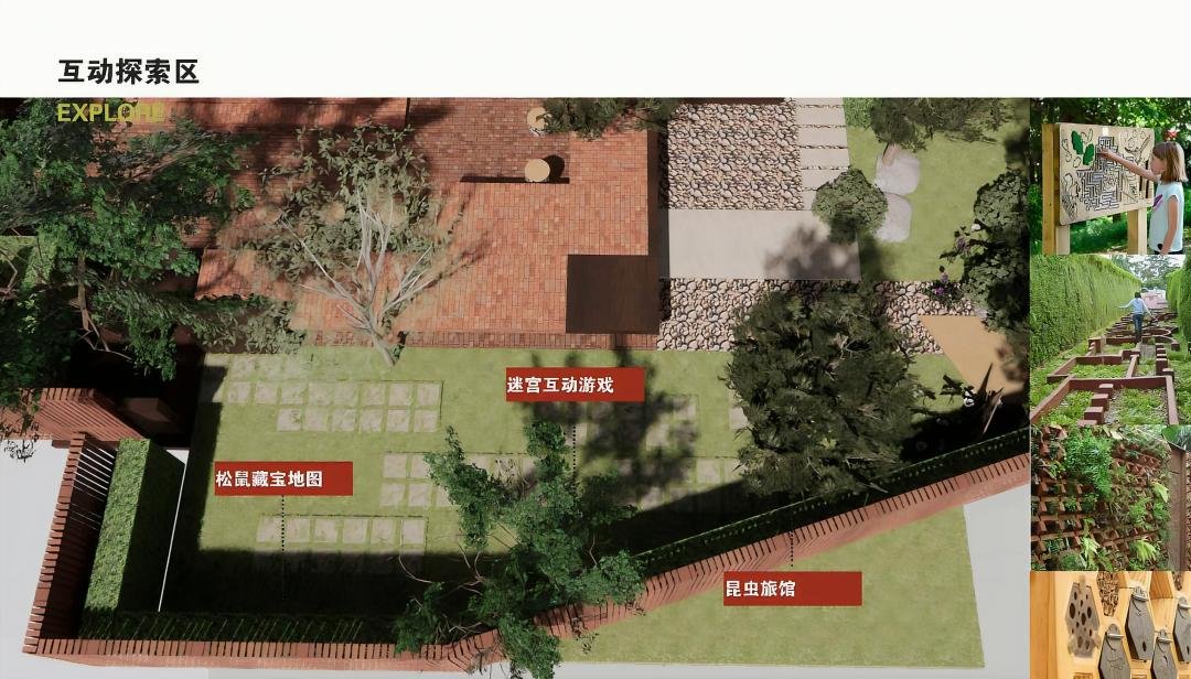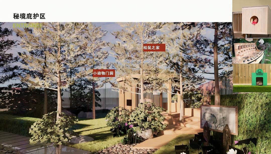 岐山村生境花园,以本土物种赤腹松鼠为主题,充分考虑城市小动物的栖息环境,为洋房区里的“小邻居们”留出适宜的生活空间。