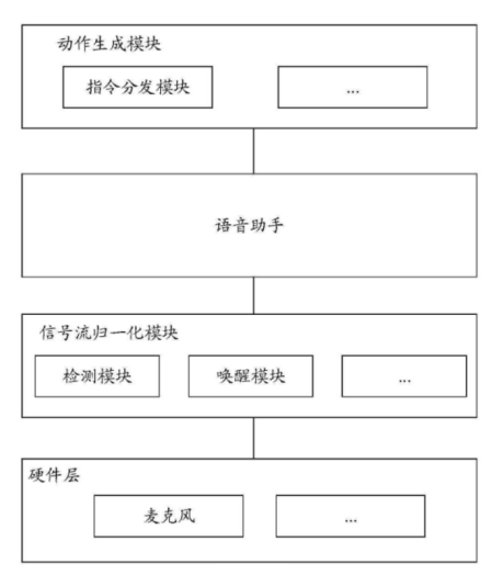 图2是本专利提出的系统架构示意图。该系统架构包括硬件层、信号流归一化模块、语音助手和动作生成模块。其中,硬件层主要指麦克风用于采集语音信号并将采集到的语音信号发送给信号流归一化模块。信号流归一化模块包括检测模块和唤醒模块,检测模块可以判断发出该语音信号的声源位置,而唤醒模块直接将该语音信号转化为文本内容,最后发送给语音助手。语音助手对用户的意图进行分析并根据用户的意图生成相应的车控指令发送给动作生成模块。动作生成模块中包含指令分发模块,用于在确定声源位置为车外时判断该车控指令是否为高危车控指令。如果是高危车控指令,则不将该车控指令发送给相应的执行器;否则,将该车控指令发送给相应的执行器。