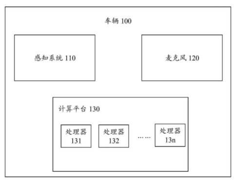 图1为本专利提出的一种车辆功能框示意图,车辆100包括感知系统110、一个或者多个麦克风120和计算平台130。其中,感知系统110是指感测关于车辆100周边的环境信息的传感器,比如定位系统、激光雷达等。对于麦克风120,主要考虑到用户会乘坐在不同位置,因此相应位置可能都会设置麦克风。此外,车辆100的部分或所有功能由计算平台130控制,计算平台130包括一个或多个处理器。