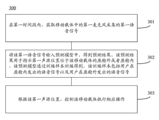 图3为判语音交互方法300的示意性流程图,该方法300可以由车辆或者计算平台执行。首先在第一时间段内,获取移动载体中的第一麦克风采集的第一语音信号(S301)。然后将该第一语音信号输入预测模型中,得到预测结果,该预测结果用于指示第一声源位置位于该移动载体的座舱外或者座舱内,该预测模型通过训练样本训练得到,该训练样本包括用户在座舱内发出的语音信号以及用户在座舱外发出的语音信号(S302)。最后,根据该第一声源位置,控制该移动载体执行相应操作(S303)。
