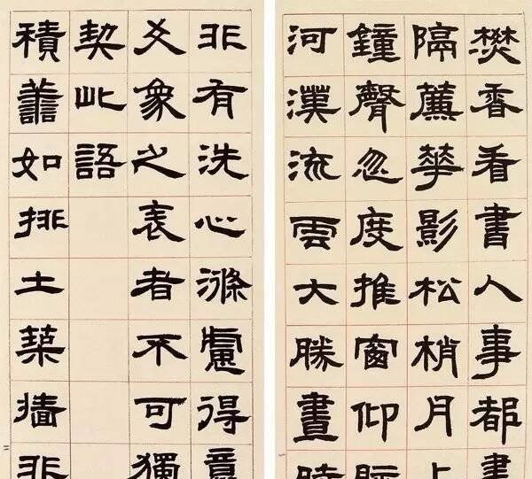 后来学邓石如隶书的不少,赵之谦是继承并创造性发展邓隶的一个典型。赵之谦推崇邓隶:“国朝人书以山人为第一,山人书以隶为第一。”赵之谦隶书和邓石如隶书一样密、繁,字内黑多白少,结构平正谨严,不少笔画的写法来自邓隶,但赵隶又融入北碑笔法及体势,更突出了书写节奏感和线条流动感,侧锋使用更多,或许因此其厚度感、沉稳感不及邓隶。