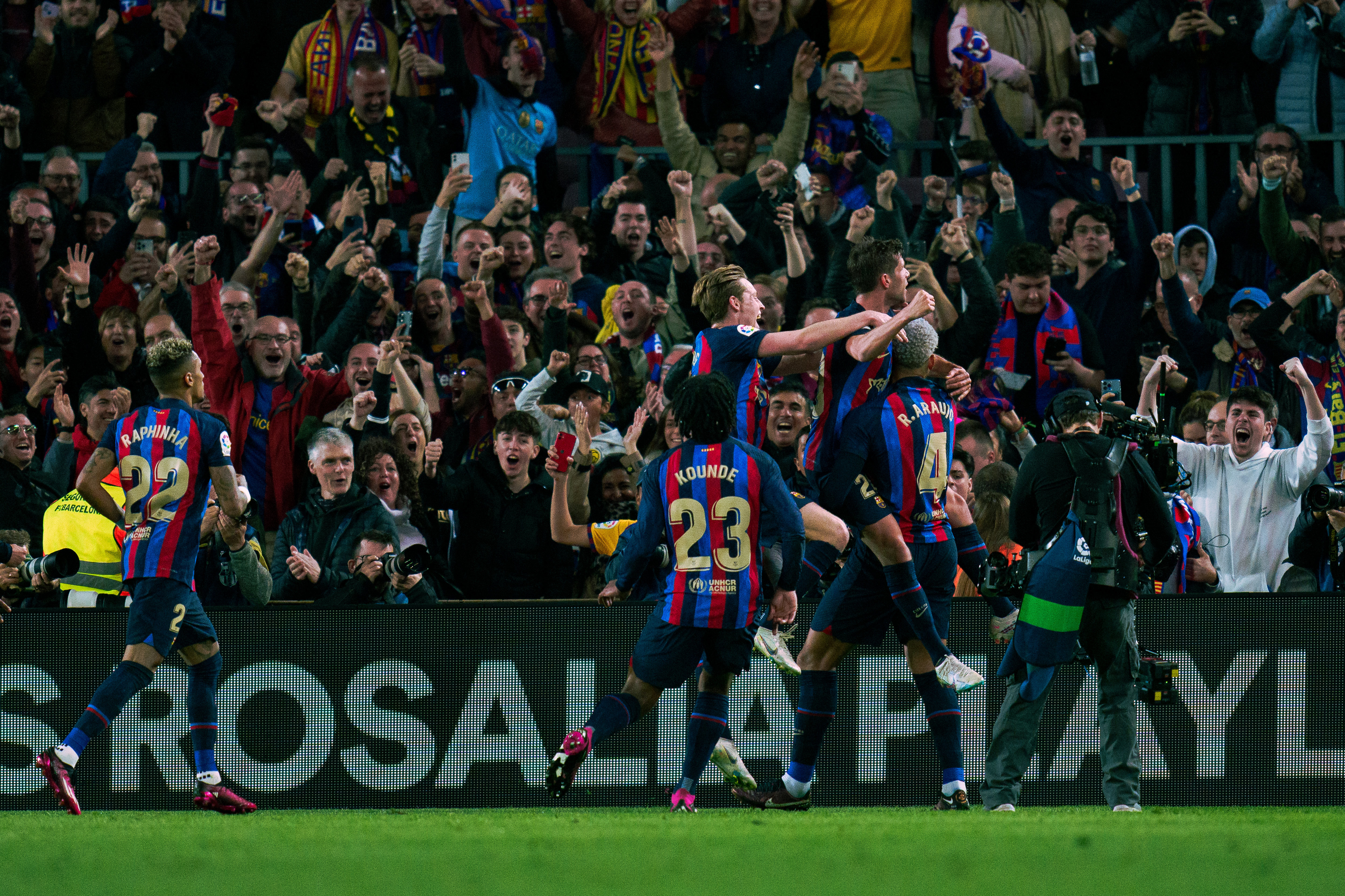 3月19日,巴塞罗那队球员在比赛中庆祝进球。新华社发(胡安·戈萨摄)
