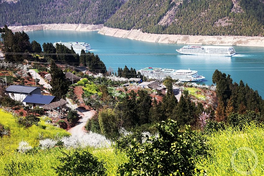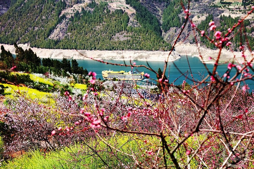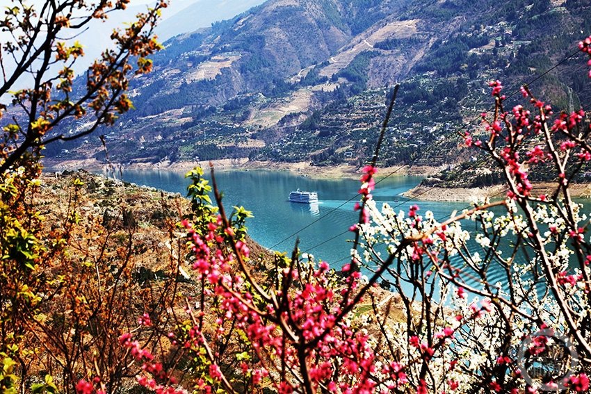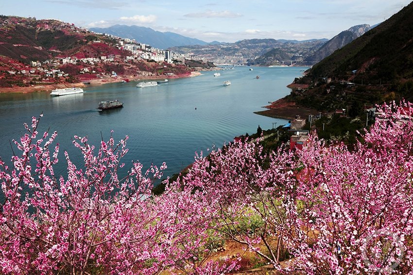 “山似桃花艳,流如明月光”。壮丽新三峡黄金水道豪华游轮碧水慢游,物流船舶正忙争春。大有“人在花海醉,船在画中游”的绝美意境。