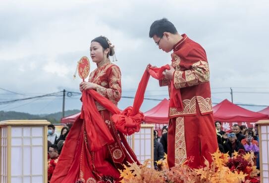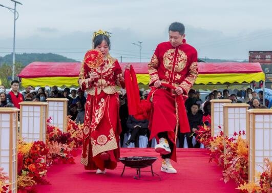 婚礼现场,10对新人按照传统习俗,缓步走向舞台,依次迈过火盆、跨过马鞍、集体宣誓,争做新时代新风尚的倡导者、传播者和实践者,争做移风易俗、文明婚礼的推动者和引领者。“有请众新人怀虔诚之心,行三拜之礼。”在证婚人、亲友及现场群众的共同见证下,庄重地行三揖三拜之礼,同饮合卺酒,默默许下相敬互爱、相守一生的誓言。