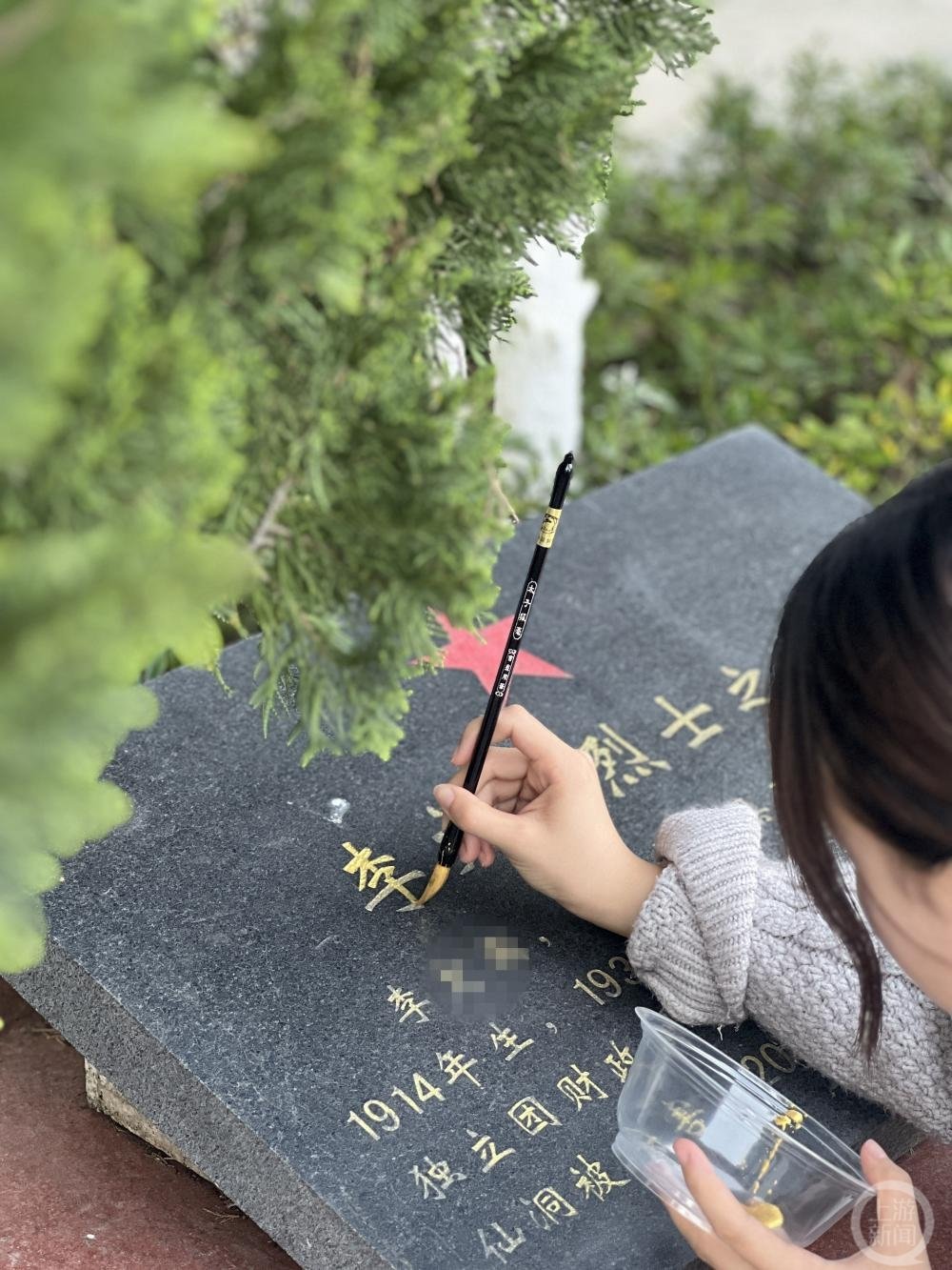 ▲黄女士正在为烈士墓碑描金。图片来源/受访者供图