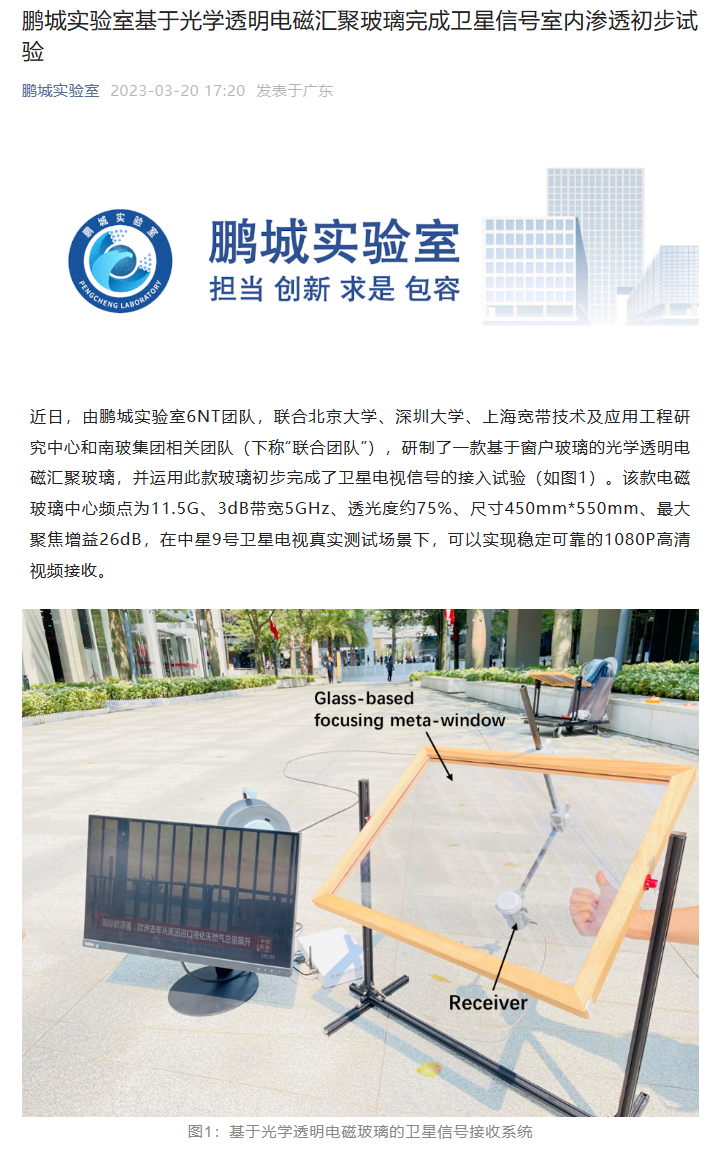 IT之家 3 月 20 日消息,据鹏城实验室消息,近日,由鹏城实验室 6NT 团队,联合北京大学、深圳大学、上海宽带技术及应用工程研究中心和南玻集团相关团队(下称“联合团队”),研制了一款基于窗户玻璃的光学透明电磁汇聚玻璃,并运用此款玻璃初步完成了卫星电视信号的接入试验。