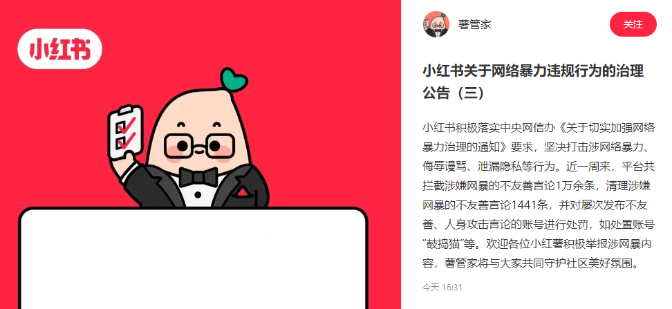 公告显示,小红书积极落实中央网信办《关于切实加强网络暴力治理的通知》要求,坚决打击涉网络暴力、侮辱谩骂、泄漏隐私等行为。近一周来,平台共拦截涉嫌网暴的不友善言论1万余条,清理涉嫌网暴的不友善言论1441条,并对屡次发布不友善、人身攻击言论的账号进行处罚,如处置账号“鼓捣猫”等。