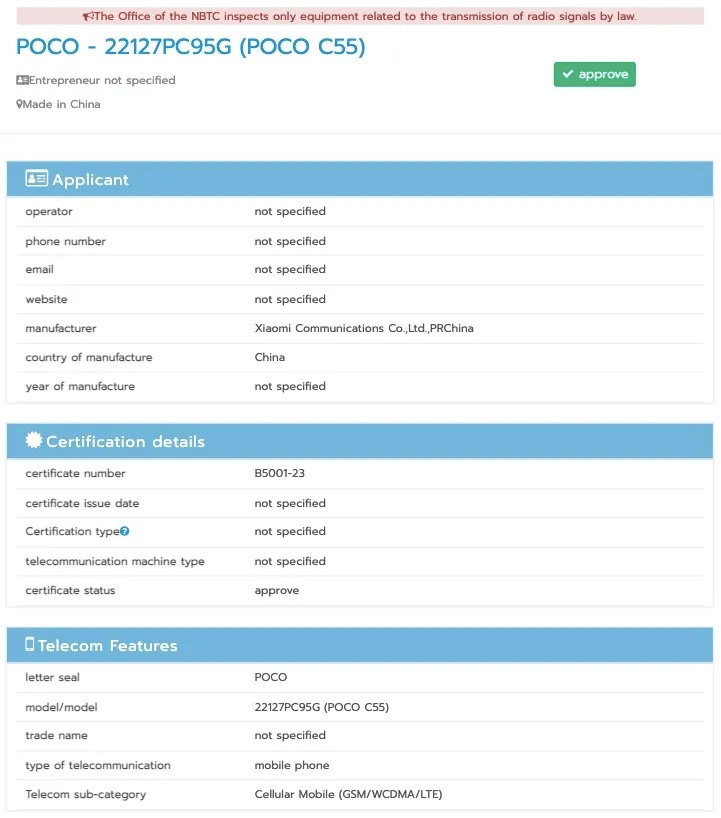 消息显示,此次通过 NBTC 和 Geekbench 认证的新机设备型号为 22127PC95G(IT之家注:设备型号末尾为 G,代表全球版本),设备名为 POCO C55。