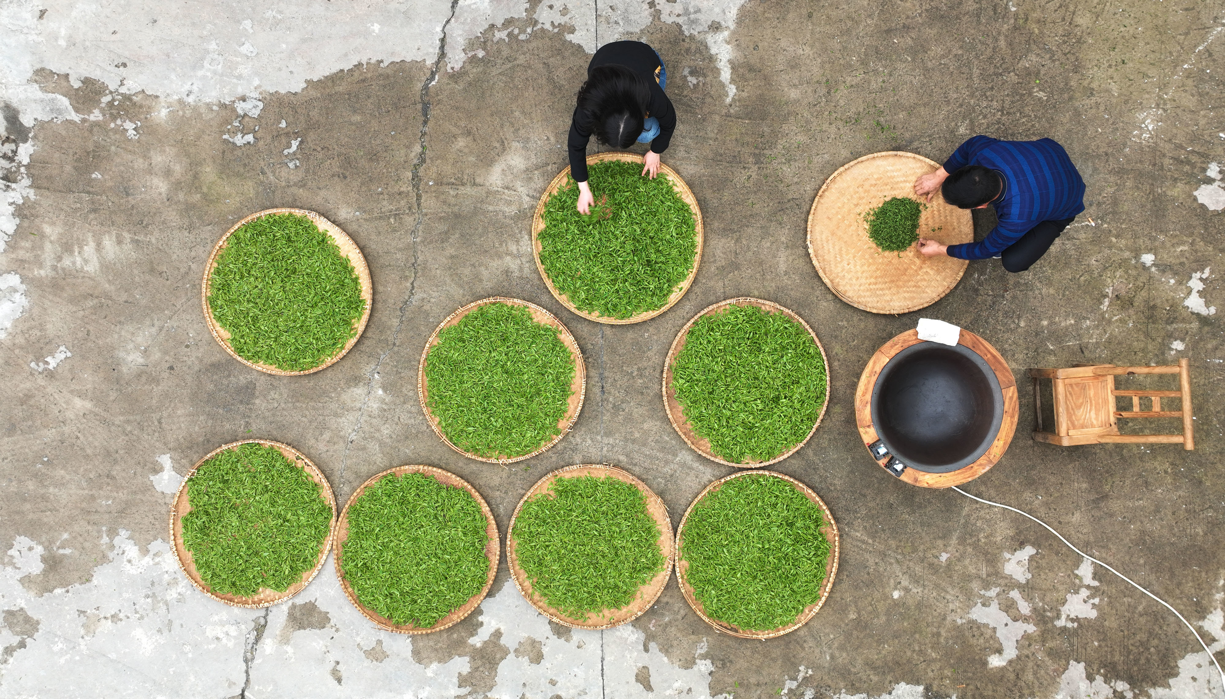 3月20日,在湖南衡阳常宁市塔山瑶族乡,茶农在炒茶(无人机照片)。新华社记者 赵众志 摄