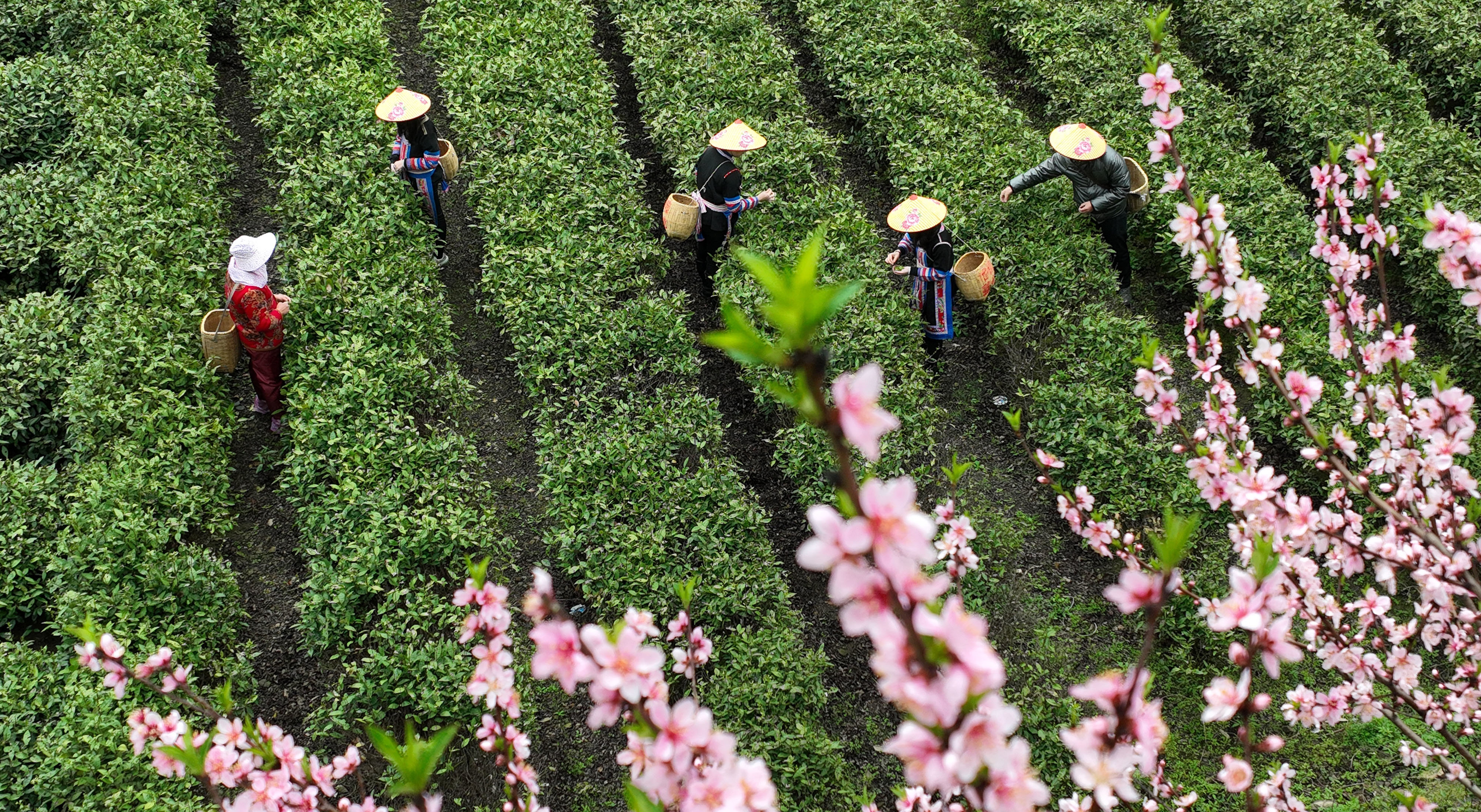 3月20日,在湖南衡阳常宁市塔山瑶族乡,茶农在茶园采茶(无人机照片)。新华社记者 赵众志 摄