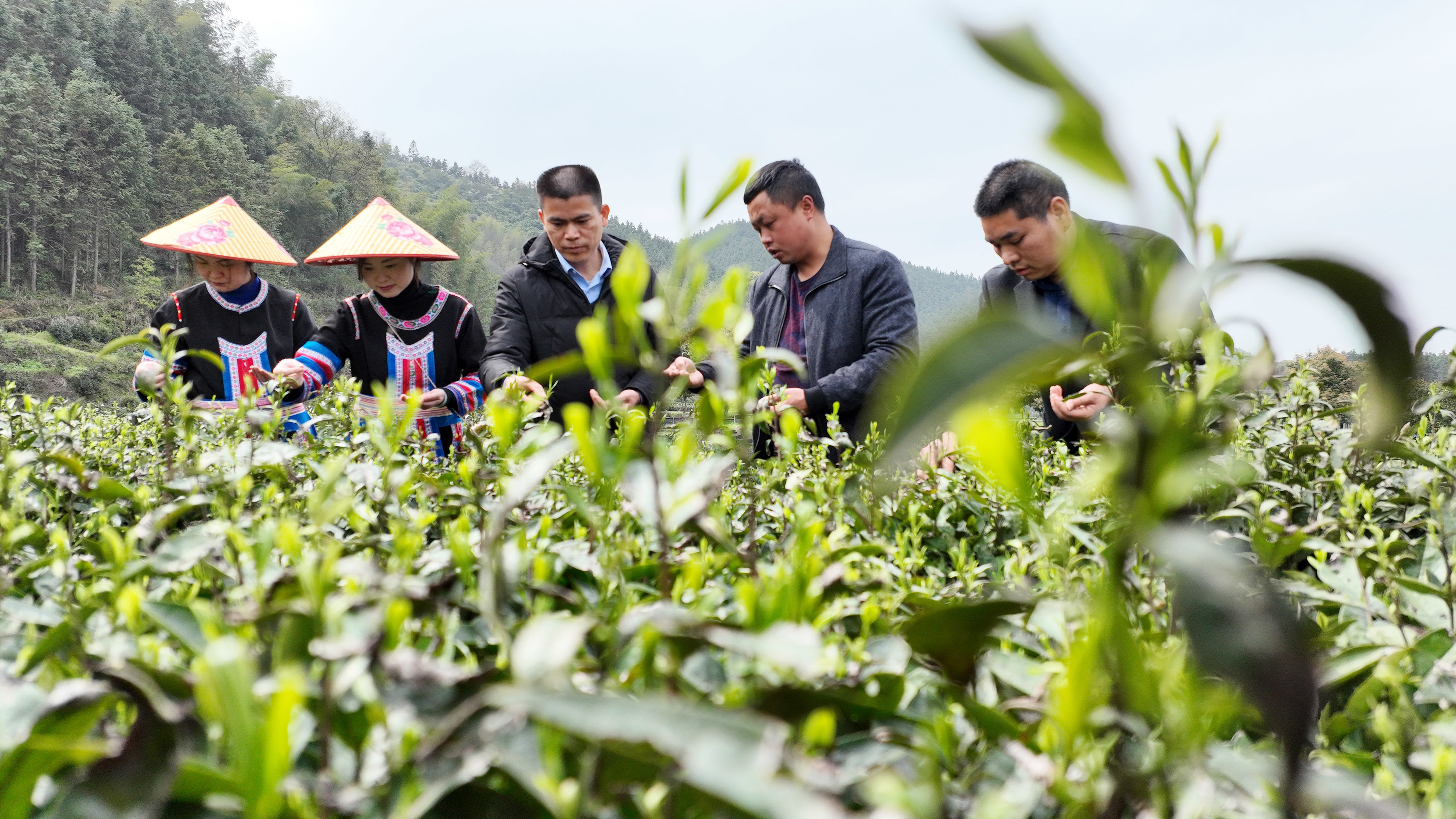 3月20日,在湖南衡阳常宁市塔山瑶族乡,技术人员在茶园指导茶农采茶(无人机照片)。新华社记者 赵众志 摄