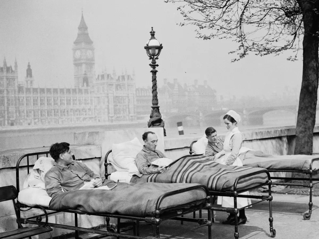在当时的英国,一家医院的肺结核病人正在泰晤士河边的病床上休息