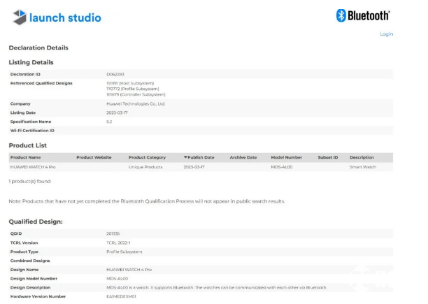 一款华为智能手表通过蓝牙SIG认证,型号为MDS-AL00,消息透露这款手表是华为Watch 4 Pro。