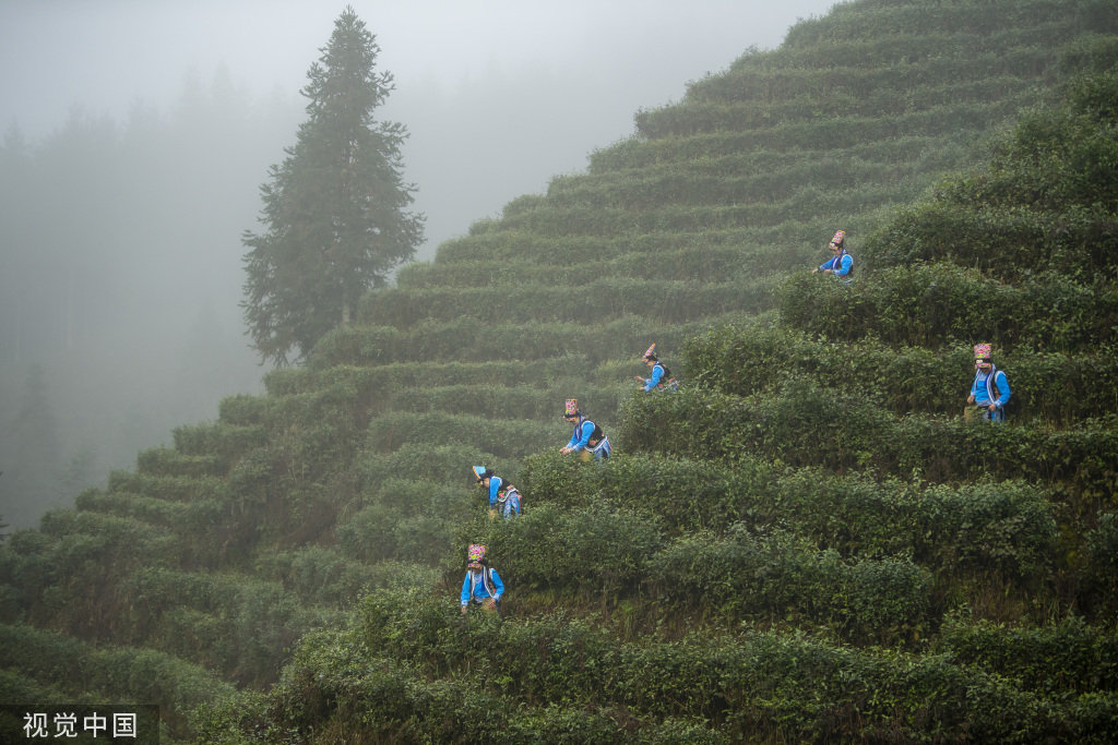 3月21日清晨,海拔1300-1500米的四川省洪雅县瓦屋山镇复兴村高山茶园云雾缭绕,600亩的高山茶园里茶农们忙着采摘茶叶嫩芽,与春意浓浓的茶园构成一幅美丽的春日画卷。 刘忠俊 摄