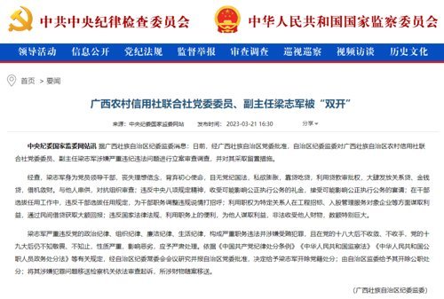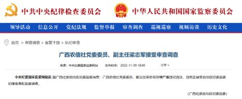 2022年11月,据广西壮族自治区纪委监委消息,广西农信社党委委员、副主任梁志军涉嫌严重违纪违法,接受自治区纪委监委纪律审查和监察调查。