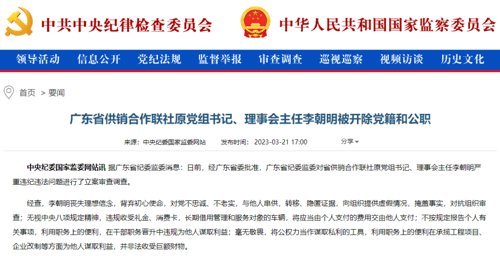 广东省供销合作联社原党组书记、理事会主任李朝明被开除党籍和公职