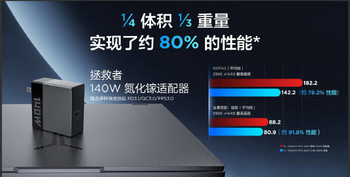 据官方测试数据显示,在 Y9000P 2023 这款游戏本上,在《DOTA 2》中以 2K 最高画质运行时,使用原装 300W 适配器的帧数为 182.2,而使用 140 充电器的帧数为 142.4;在《古墓丽影:暗影》中以 2K 最高画质运行时,帧数分别为 88.2 和 80.9。