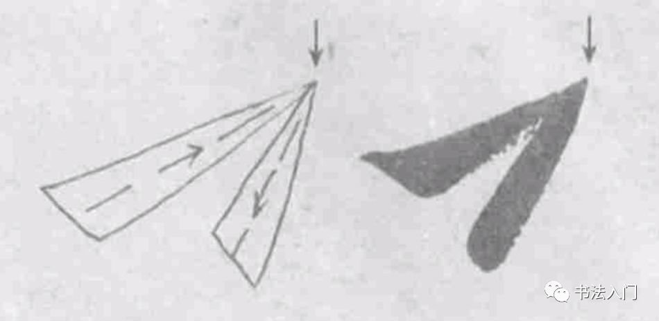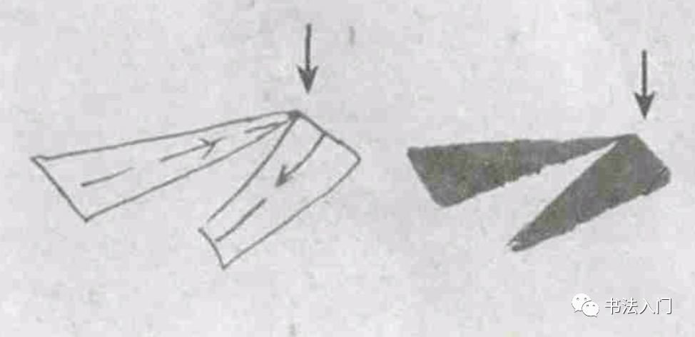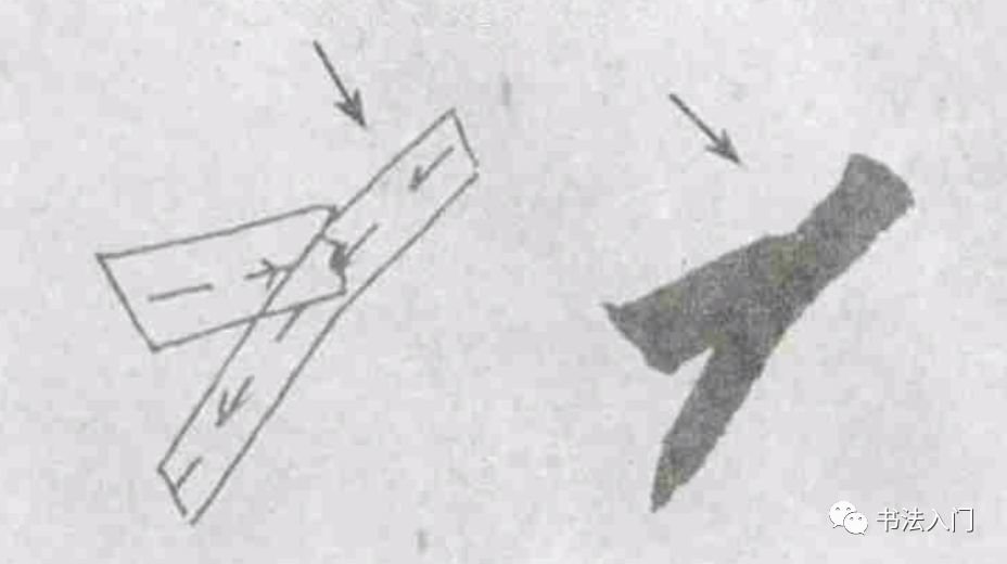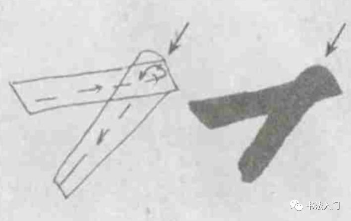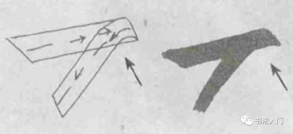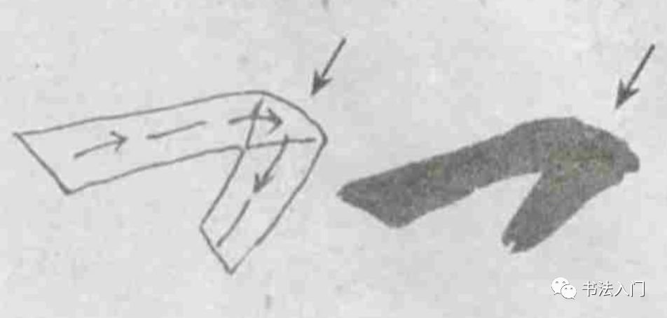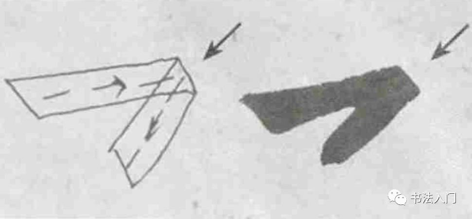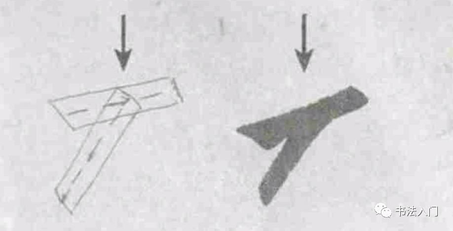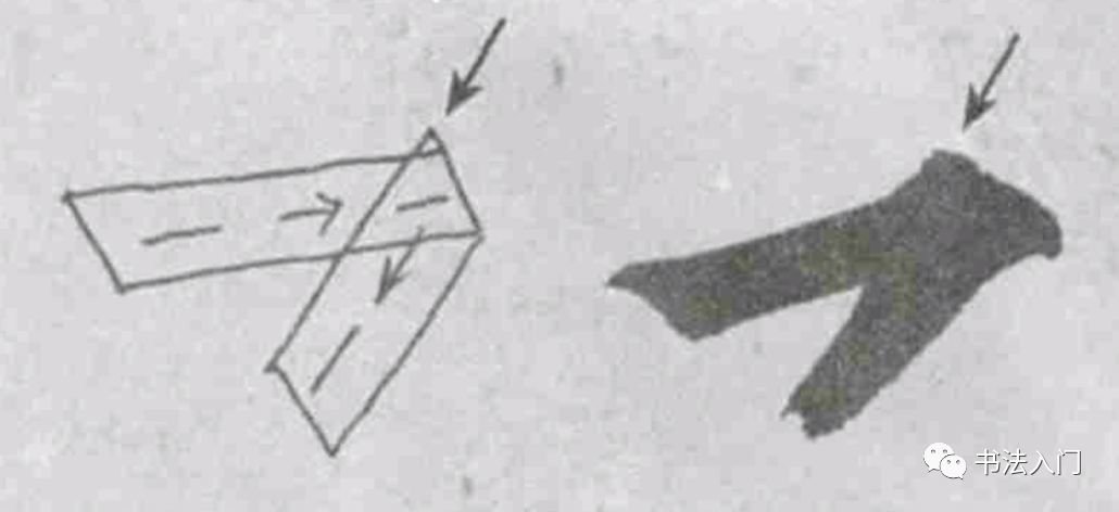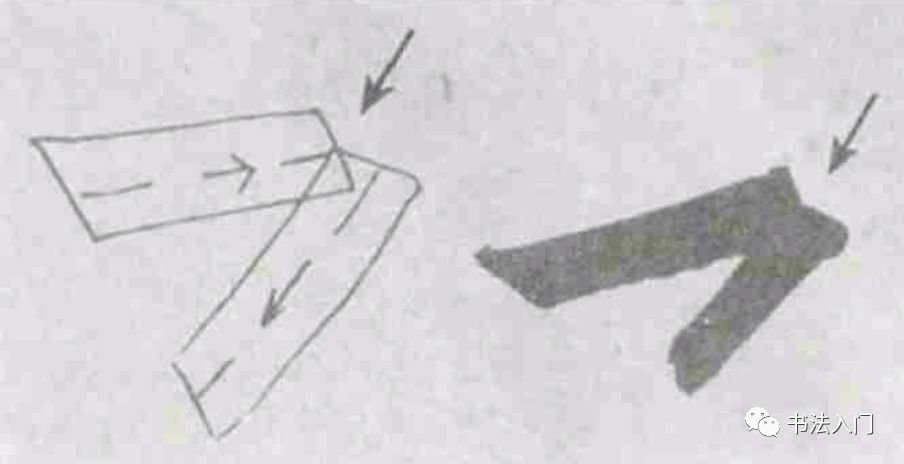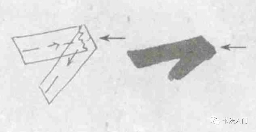 该折笔分为两笔写出。书写方法是毛笔行至折笔处,提笔离纸,然后重新落笔折笔写出,如图33所示。