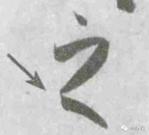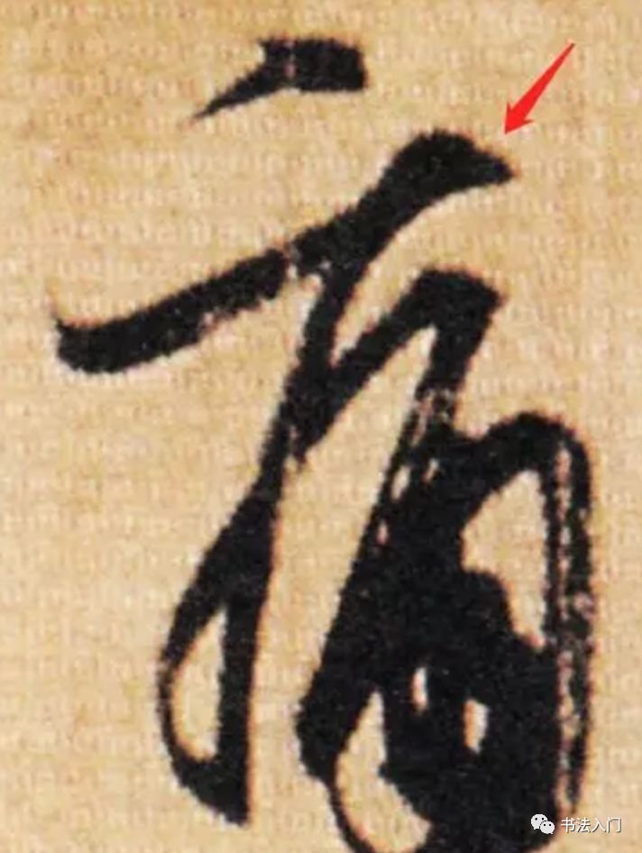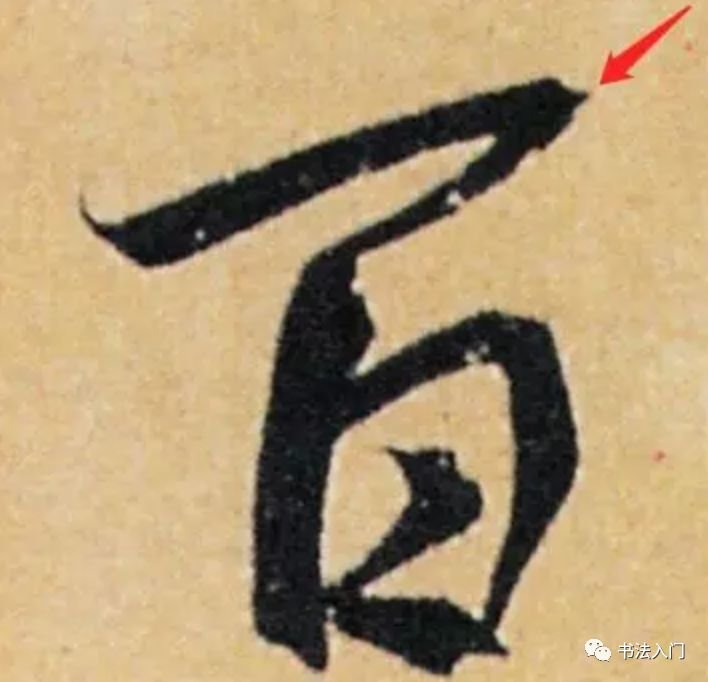 翻折的书写方法是在折笔处,毛笔向上翻转后折笔写出,它与压折的区别在于它上面的突起是圆转的,而压折的突起则是方头的,如图21、图22、图23所示。