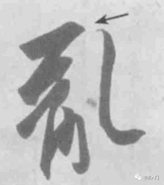 搭折的书写方法是行笔至折笔处,毛笔提至线条的一角,然后向下加压折笔写出。突出的特点是两根线条搭接在一起,连接处有个V字型的凹陷。如图30、图31、图32所示。
