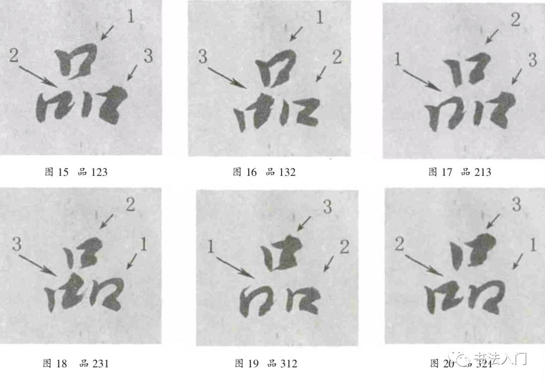 在训练不同的“品”字时,会遇到这样一个问题:书写不同“品”字,调换不同的转折,往往容易混淆不清。解决的方法是给转折编号,如转笔为1号,直折笔为2号,压折笔为3号。这样,书写不同的“品”字,只需调换不同的数字组合即可。
