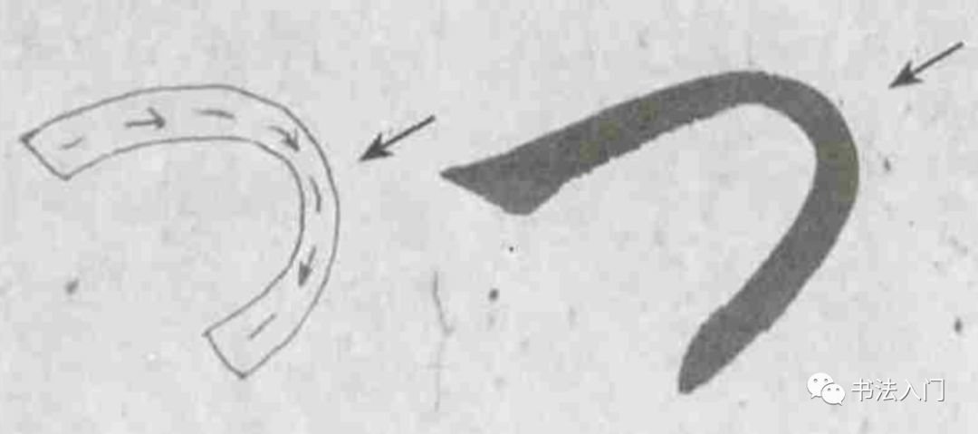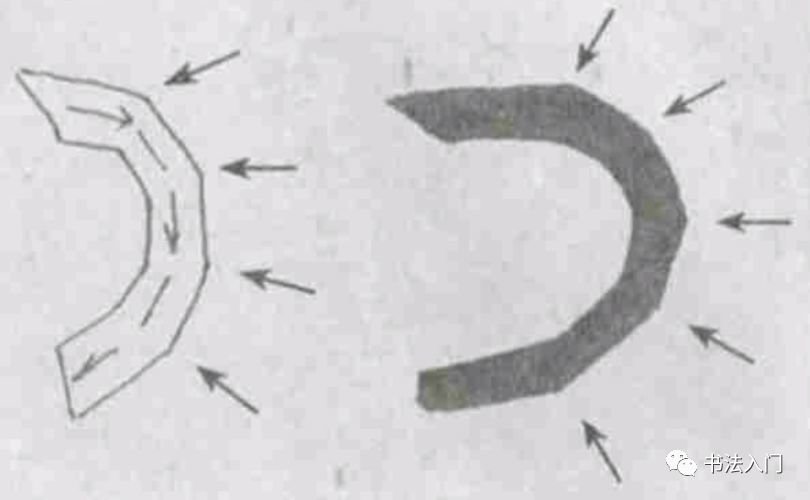 回,就是在进行折笔书写时,毛笔先按原路往回行笔,然后向下折笔写出。凹,就是折笔处的下方有个凹陷处。翻折与回凹折的相似处在于它们都有凹陷处,但翻折上方有圆的突起,而回凹折则没有。如图24、图25、图26所示。