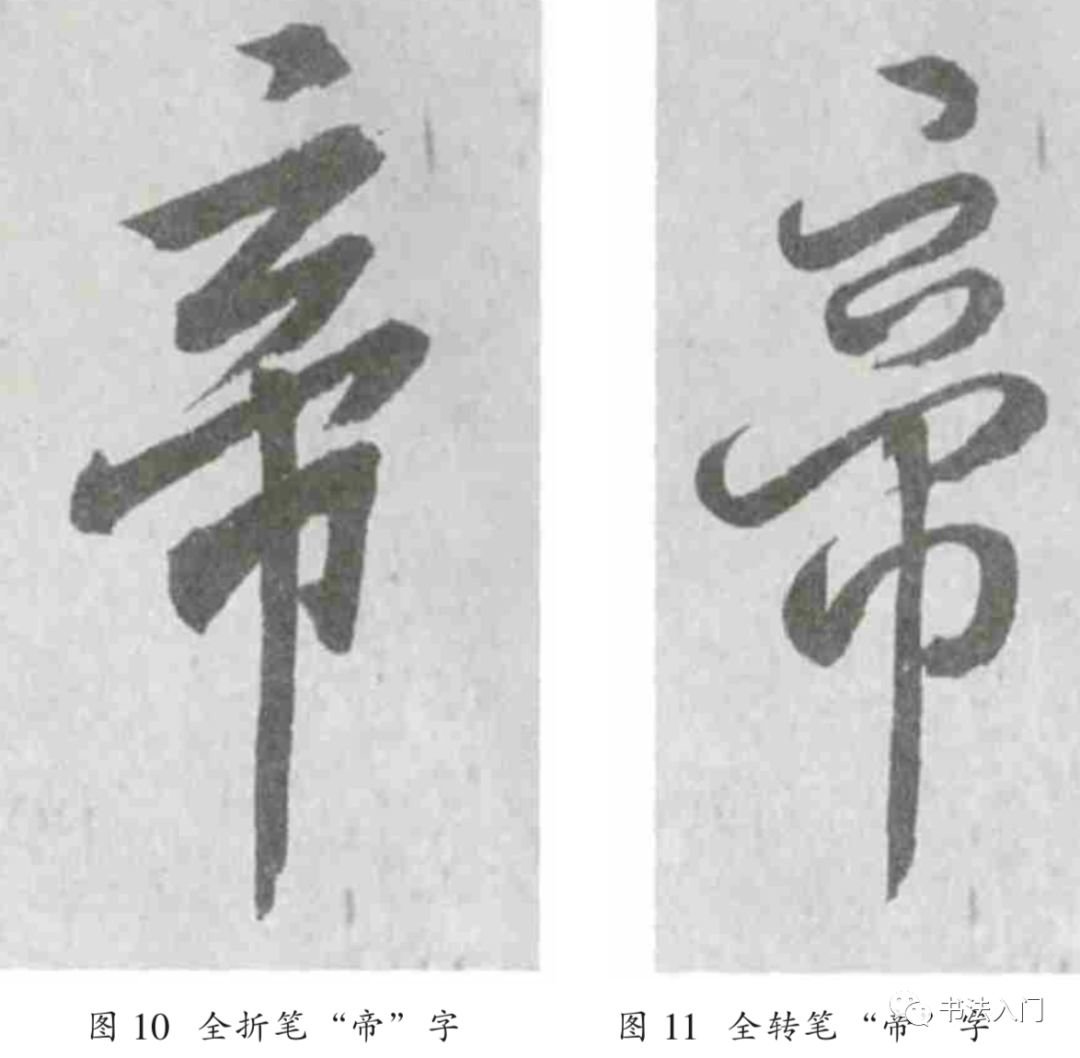 我们以“帝”为例,分别用转笔和折笔书写,图10的“帝”字转折处全是折笔;图11的“帝”字转折处全是转笔。